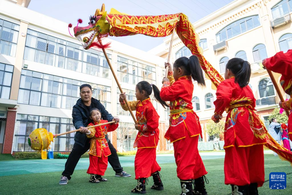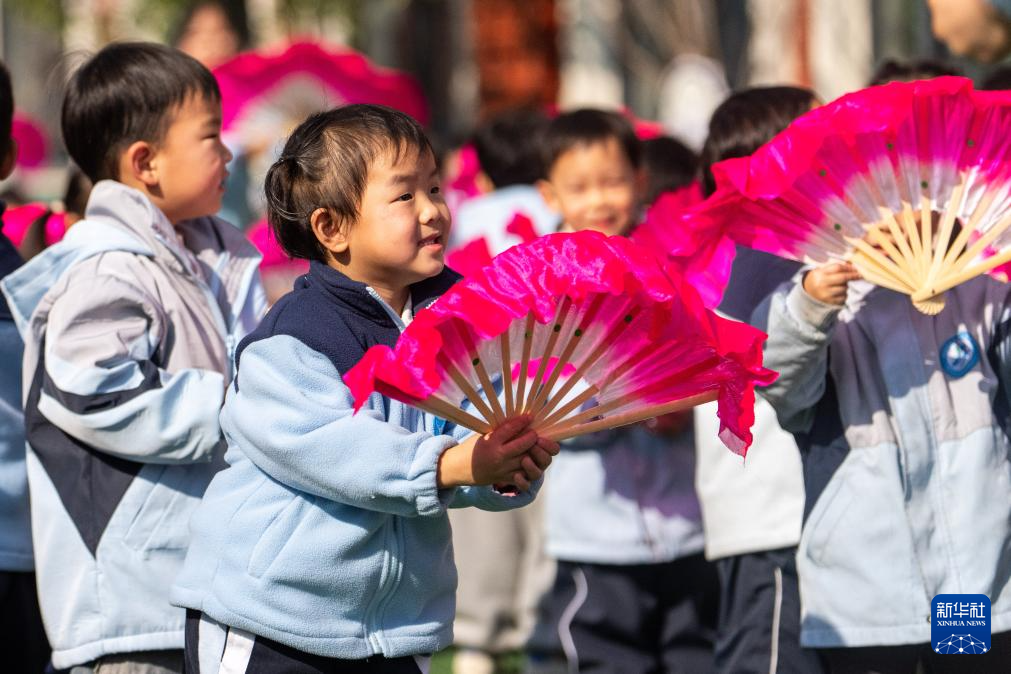 1月13日,在南县第三实验幼儿园,学生在课间练习南县地花鼓。新华社记者 周勉 摄