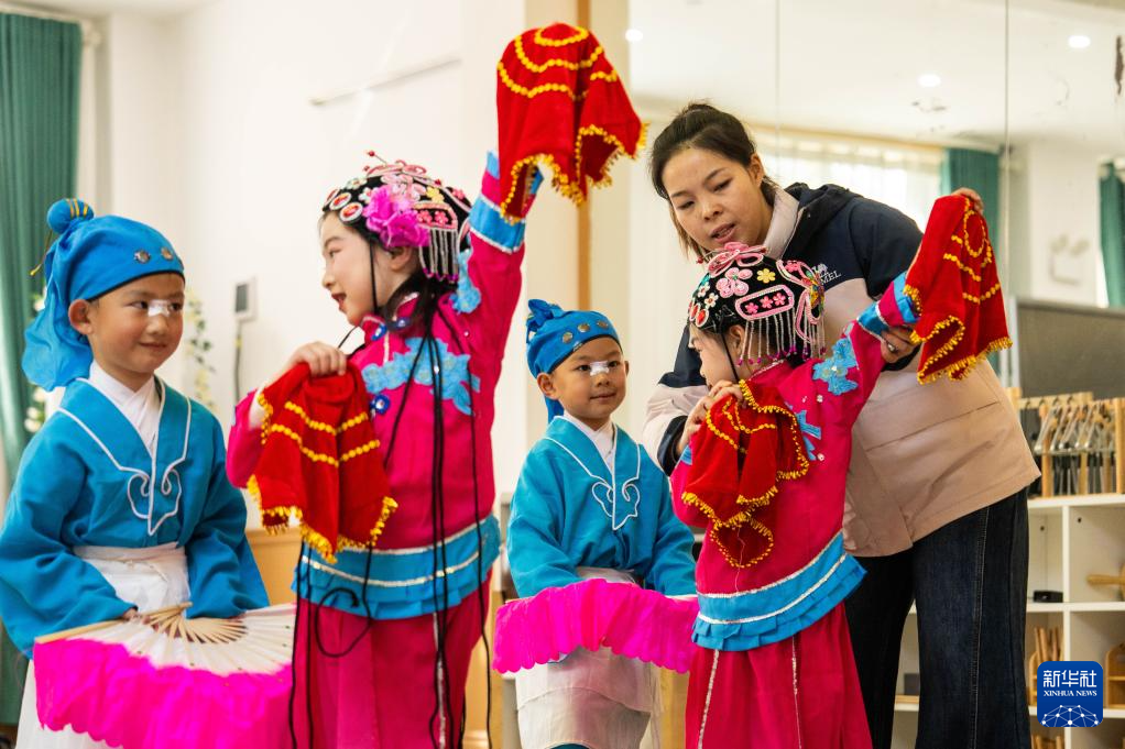 1月13日,在南县第三实验幼儿园,老师在指导学生练习南县地花鼓。新华社记者 陈思汗 摄