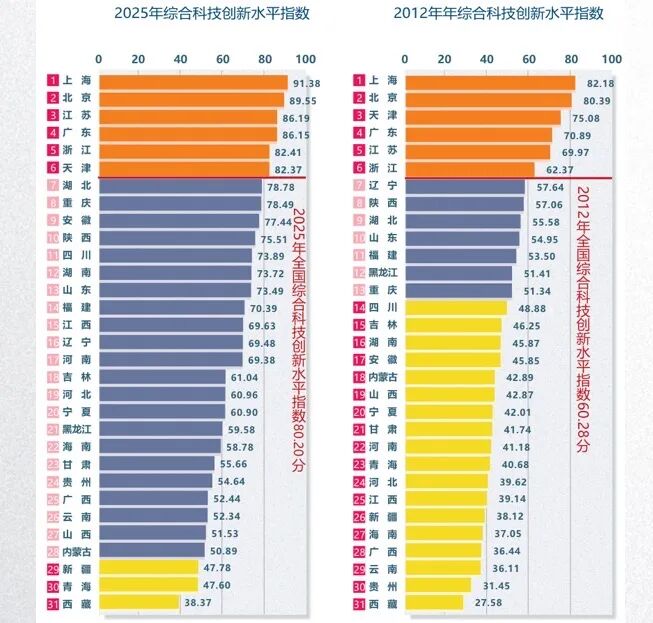 今年伊始,中国科学院分子植物科学卓越创新中心Jeremy Murray(杰睿)研究员团队与张余研究员团队在《科学》杂志在线发表了科研论文,破解了困扰植物学界20多年的难题。 作为该中心引进的外籍人才,加拿大籍研究员杰睿已在上海生活八年,这也是他第二次在《科学》杂志上发表论文。他对第一财经介绍,他在上海的研究组规模比之前的都大,所以可以去做一些想做的研究。 12日,上海交通大学人工智能学院副院长卢策吾教授创办的科技企业穹彻智能正式推出口袋机采——通过智能手机和App,每位使用者都可以成为数据采集的参与者,完成任务并上传数据,实现数据采集。该公司是卢策吾2016年选择回国发展后创立的具身智能企业。 近年来,像杰睿、卢策吾这样的科研人员,支撑了上海科技创新成果多点开花。 官方数据显示,2025年,上海科学家发表顶刊论文181篇,占全国的30.6%,较2024年增长14.6%。其中第一作者或通讯作者109篇,占全国的24.1%,较2024年增长29.8%。2022~2025年,上海市财政科技支出年均增幅超过20%,基础研究投入总体增长85%;“十四五”时期,上海全社会研发经费支出相当于全市生产总值的比例提高到4.5%左右。 另据中国科学技术发展战略研究院发布的《中国区域科技创新评价报告2025》(下称“报告”),上海得分为91.38,居全国之首,同比提高2.18分。 “从十八大以来的历年评价报告结果来看,全国各个省份的科技创新能力均有大幅提升,其中上海科技创新能力在全国一直保持领先位势,这表明上海在推动我们国家整体科技创新能力提升方面一直处于引领地位,做出了突出贡献。”报告撰写团队负责人之一、中国科学技术发展战略研究院科技统计与区域创新研究所所长玄兆辉接受第一财经记者采访时说。 关键指标表现亮眼 自1993年起,中国科学技术发展战略研究院便启动了区域科技创新评价研究。2015年起,研究报告正式纳入国家创新调查制度系列报告。报告基于政府公开统计数据,对全国31个省、自治区、直辖市(不包含港澳台)的综合科技创新水平进行客观评价。目前,报告已成为国家和地方科技管理决策的重要参考和指引,也是目前国内持续时间最长、评价体系最为稳定的区域科技创新评价研究成果。 2025年,报告在2024年的基础上,新增公民具备科学素质比例、高技术产业固定资产净额占工业固定资产净额比重、获国家级科技成果奖系数等8个指标,删除了3项指标。从科技创新环境、科技创新投入、科技创新产出、高新技术产业、创新促进发展5个一级指标、12个二级指标、49个三级指标综合测算科技创新水平指数。