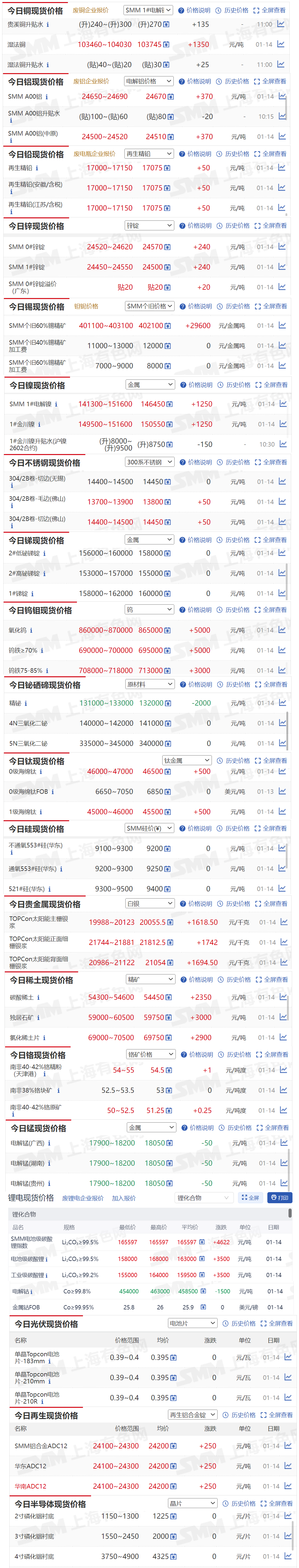 SMM1月14日讯: 金属市场方面: 截至午间收盘,内盘基本金属全线上涨,沪铜涨1.68%,盘