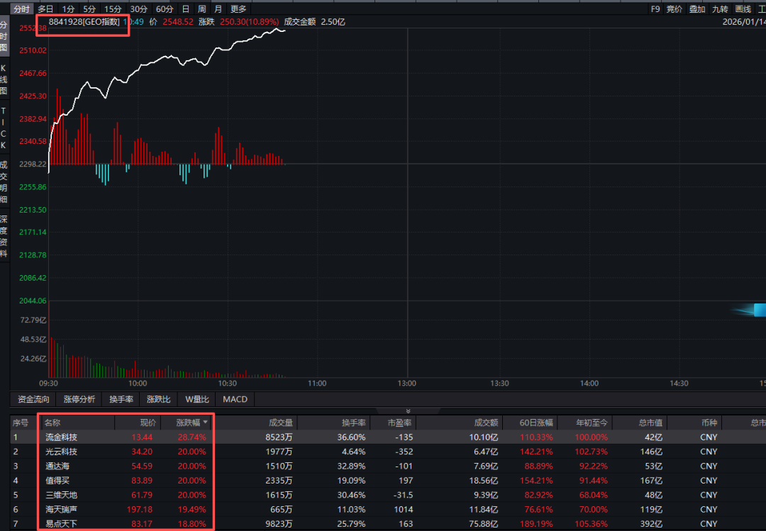 GEO概念连续大涨,多股发布澄清公告和风险提示。 A股、港股GEO概念大涨 A股GEO(Generative Engine Optimization,生成引擎优化)概念连续大涨,与此同时,相关澄清公告和风险提示也密集出现。 今天(1月14日)上午,A股市场GEO概念大涨,成为引领市场的主要亮点之一。万得GEO概念指数在此前几个交易日连续上涨的基础上,今天上午盘中大涨逾8%,该指数的成份股中,流金科技盘中涨幅超过26%,值得买、光云科技盘中“20cm”涨停,通达海、易点天下、天龙集团、海天瑞声等股票盘中涨幅超过10%,浙文互联等多股盘中涨停。