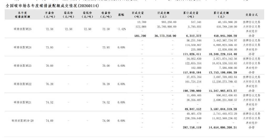 1月14日讯: 今日全国碳市场综合价格行情为: 开盘价72.50元/吨,最高价72.50元/吨,最低价72.50元/吨,收盘价72.50元/吨,收盘价较前一日下跌7.42%。 今日挂牌协议交易成交量13,700吨,成交额993,250.00元;大宗协议交易成交量572,000吨,成交额35,780,000.00元;今日无单向竞价。 今日全国碳排放配额总成交量585,700吨,总成交额36,773,250.00元。 2026年1月1日至1月14日,全国碳市场碳排放配额成交量6,787,698吨,成交额488,789,228.20元。 截至2026年1月14日,全国碳市场碳排放配额累计成交量871,654,218吨,累计成交额58,151,407,459.77元。