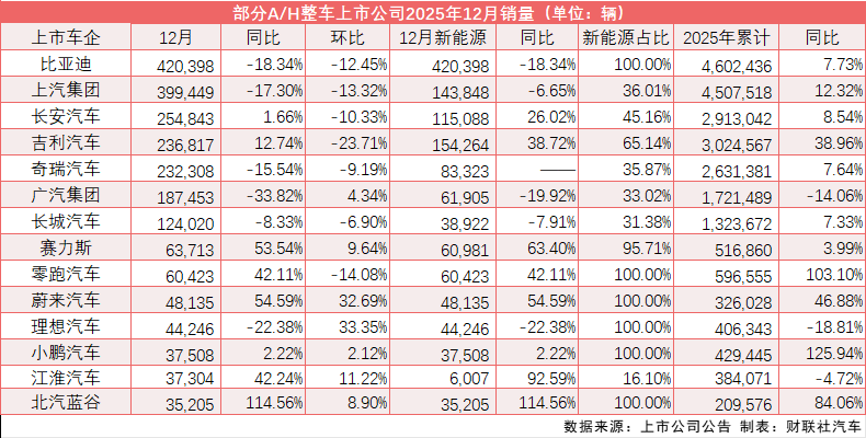 2025年12月,国内电动车“一哥”比亚迪以420,398辆的销量独占鳌头,同比下滑约18.2%;2025年累计销量超460.2万辆,同比增长7.73%。其中,纯电动车型销量达225.7万辆,同比增长27.86%,首次超越特斯拉登顶全球纯电销冠;插电式混合动力车型累计销量为228.9万辆,同比下降7.91%。此前,比亚迪定下的2025年销量目标为460万辆,如今已经超额完成其年度销量目标。 从全年数据来看,特斯拉2025年在全球的累计交付量为164万辆,较2024年的179万辆有所回落。据路透社报道,特斯拉2025年销量下滑主要是受市场竞争加剧、美国电动汽车税收抵免政策到期以及品牌形象受损导致需求下滑等因素拖累。 而新的一年,比亚迪继续发力,2026款比亚迪秦L DM-i、秦PLUS DM-i加推新车型,且2026款秦L DM-i限时兜底新能源汽车购置税,综合补贴后限时起售价为9.28万元。 上汽集团则以450.7万辆的成绩居于比亚迪之后,同比增长12.32%,销量明显回升。据悉,新能源转型、自主品牌升级及海外市场拓展成为其销量增长的三大驱动引擎。 造车新势力方面,零跑汽车成为2025年造车新势力的最后“赢家”,其自2025年3月以来,销量便一直处于新势力榜首之位,录得月销“九连冠”,且连续两个月交付突破7万辆,全年交付59.7万辆,同比增长103.1%,创新势力年销量新纪录。 值得一提的是,此前零跑汽车定下的2025年销量目标为50万辆,而早在11月15日,其便已经提前完成该目标,提前了45天。零跑汽车董事长朱江明为2026年提出了更高的目标,2026年其将向着100万辆的目标进军。 2025年12月,蔚来汽车以48135辆的成绩排名新势力第二,同比增长42.11%;2025年全年总计实现32.6万辆的成绩,同比增长46.88%。据悉,蔚来汽车此前定下的销量目标为44万辆,最终完成度为74.1%。蔚来汽车董事长李斌表示,公司2026年销量目标是保持40%-50%的速度稳步增长,并提升增长质量。2025年蔚来累计销量约32.6万辆,以此计算,2026年其销量目标为45.6-48.9万辆。 且李斌在其2025年三季度的财报电话会上还曾提到,公司2026年的经营目标是整年盈利。且其还提到,2026年新能源汽车购置税减半征收,对蔚来影响相对较小,“因为BaaS租电方案减去的电池价格,不会算在税基里,相对来说会有一些优势。明年具体用什么样的方式去应对市场变化,还要根据整个市场的情况,再采取灵活的应对策略。” 小鹏汽车在2025年新势力销量排行中排名第二,其全年42.9万辆的交付成绩,同比大幅增长125.94%;2025年12月交付37508辆新车,同比增长2.22%。据悉,小鹏汽车此前定下的2025年销量目标为38万辆,其同样在2025年11月便提前完成了其年度销量目标。 进入2026年,小鹏汽车同样火力全开,1月8日消息,小鹏汽车发布四款新车,小鹏汽车CEO何小鹏在发布会上表示,这四款新车都将搭载小鹏汽车第二代VLA(视觉-语言-动作)大模型。何小鹏称,这是行业首个实现L4级初阶能力的物理世界大模型。2026年,小鹏将迎来物理AI的落地和规模量产,将开始运营Robotaxi(无人驾驶出租车),以及规模量产人形机器人和飞行汽车。 理想汽车2025年总计交付40.6万辆新车,同比略有下滑;2025年12月共交付44246辆新车,同比下降22.38%。据悉,理想汽车此前的销量目标为64万辆,如今其最终完成度为63.44%。 1月9日,理想i8限时“0息”“0首付”金融政策上线!即日起至1月31日(含)锁单理想i8的用户,可享受3年0息政策,至高节省1.8万元利息;首付9.98万起,日供仅220元。 此外,理想超充站在2025年为全部用户提供充电服务超1953万次,为理想汽车用户提供充电服务超871万次;2025年,理想超充桩从2025年年初的9000+根增长到2万+根,站点从1700+座到3900+座。 小米汽车12月交付量超5万台,小米CEO雷军此前表示,2025年全年,小米共交付41万辆小米汽车,其年初设定的交付目标为35万台,在11月份便已经超额完成其年度销量目标。2026年1月3日,雷军表示,今年会将更多的精力放在汽车上,交付目标既不能太高也不能太低,定在了55万辆,希望2026年底能够超越这个成绩。 2026年1月1日,小米汽车官微发文称,2月28日24点前下定即可享受小米YU7全系“3年0息”, 首付7.49万元起,月供低至4961元起。 展望2026年1月的乘用车市场,乘联分会预测称,2026年1月共有20个工作日,较去年同期多一天,较12月的20个工作日少3天,由于2026年春节在2月16日,考虑到去年春节提早放假因素,今年1月生产销售时间相对充裕。 此外,其还提到,2025年促进汽车消费的国家报废更新和各地以旧换新政策已取得良好效果,但第四季度的乘用车零售增速转为-5%的收缩。部分消费者年末购车的观望心态加剧,但这也为2026年年初车市积蓄一定的动能。2026年以旧换新政策虽补贴力度形成梯度退坡,但相较去年启动早,整体看有利于稳定消费预期,有利于1月“开门红”。每年1月的“开门红”是地方政府和车企多年来共同努力的方向,结合2月份春节影响,因此在1月会形成一定的批发转移量;结合当前市场预收订单模式,部分企业仍有相当规模的订单处于待交付状态中。作为“十五五”的开局,加之今年是汽车消费大年,预计1月的同比销量会实现微增长。 2026年展望 展望2026年,乘联分会表示,2026年政策鼓励商用车更新补贴力度保持不变,而乘用车报废更新按2025年结构测算下降20%,以旧换新测算最大下降30%,2026年商用车的增长效果预计好于乘用车。2026年乘用车市场预计走势“前高中低后高的U型”走势,总体车市销量持平于2025年国内零售量。出口仍保持10%