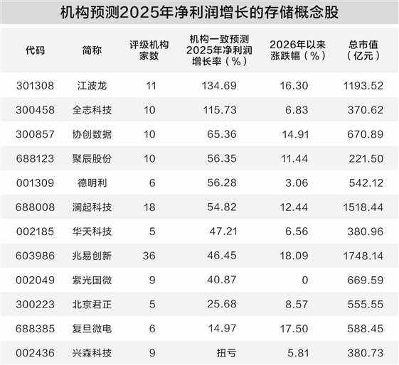 证券时报记者 刘俊伶 1月14日,A股存储模组龙头佰维存储发布业绩预告,盈利实现大幅增长。公司预计2025年度实现营业收入100亿元至120亿元,同比增长49.36%至79.23%;预计实现归母净利润8.5亿元至10亿元,同比大幅增长427.19%至520.22%。 公司表示,从2025年第二季度开始,随着存储价格企稳回升,重点项目逐步交付,公司销售收入和毛利率逐步回升,经营业绩逐步改善。 价格持续上行 2025年以来,全球存储市场步入一轮强劲的涨价周期。Wind数据显示,DRAM(动态随机存取内存)方面,DDR5(16Gb)1月14日报价34.08美元,较去年年初的4.68美元上涨627.79%;DDR4(16Gb)报价75美元,较去年年初的3.19美元涨幅更是达到2252.57%。NAND Flash(闪存)方面,64G闪存产品最新报价7.113美元,较2025年年初上涨超60%。 随着AI算力需求爆发,存储芯片市场迎来强劲的需求拉动。IDC预测,全球数据量将在2025年达到213.6ZB,预计到2029年将增至527.5ZB,年复合增长率高达25.4%。中国的数据量预计将从2025年的51.8ZB激增至2029年的136.1ZB,年复合增长率高达27.3%。数据爆发式增长下,存储器的需求持续攀升。 同时,因产能向高端型号倾斜,一般型DRAM、闪存等价格明显上涨。根据TrendForce集邦咨询最新调查,2026年第一季由于DRAM原厂大规模转移先进制程、新产能至服务器、HBM应用,导致其他市场供给严重紧缩,预估整体一般型DRAM合约价将季增55%~60%。NAND Flash则因原厂控管产能和服务器强劲拉货排挤其他应用,预计各类产品合约价持续上涨33%~38%。 花旗研究团队在最新报告中明确指出,预计2026年商品存储器市场将出现“严重的供应短缺”。这种短缺并非暂时性的供应链扰动,而是由结构性数据增长驱动的。花旗将2026年DRAM的平均售价同比增速预期从之前的增长53%大幅上调至增长88%。 企业积极扩充产能 面对持续的涨价趋势,各大存储厂商纷纷抛出扩产计划,以把握市场机遇并提升全球市场份额。 A股上市公司中,通富微电已发布定增预案,拟募资不超过44亿元,其中8亿元用于存储芯片封测产能提升项目,建成后年新增存储芯片封测产能84.96万片。通富微电表示,实施本次募集资金投资项目旨在优化公司产能水平及结构布局,提升公司持续创新能力,实现公司业务升级。 上市公司中,天山电子、长电科技也公布扩产计划。 此外,近期多家存储厂商的IPO进程值得关注。1月13日,兆易创新H股上市,净募资额约为46.11亿港元,其中约35%将用于战略性行业相关投资及收购。兆易创新在投资者调研活动中表示,公司LPDDR4预计在2026年上半年推出产品,并在下半年实现量产,基于新产线的DDR4产品预计在下半年推出样品。 长鑫科技已递交科创板IPO招股说明书,公司是我国规模最大、技术最先进、布局最全的DRAM研发设计制造一体化企业。根据Omdia数据,按出货量统计,公司已成为中国第一、全球第四的DRAM厂商。根据招股说明书,公司募资主要用于存储器晶圆制造量产线技术升级改造项目、DRAM存储器技术升级项目、动态随机存取存储器前瞻技术研究与开发项目。 存储公司业绩可期 随着存储价格自低位快速反弹,A股相关上市公司盈利能力明显提升。 证券时报·数据宝根据5家及以上机构一致预测数据,12只存储器概念股预计2025年度实现净利润同比增长或扭亏,其中江波龙、全志科技预测净利润增幅超100%,龙头股兆易创新、澜起科技预测净利润增幅在40%以上。 江波龙2025年第三季度业绩已经大幅增长,单季度实现归母净利润6.98亿元,同比增长近20倍。截至2025年7月底,公司自研主控芯片全系列产品累计出货超8000万颗。国信证券表示,公司已点亮SOCAMM产品,作为面向新一代AI数据中心设计的低功耗内存模块产品,根据公司内部评估,SOCAMM相同容量下带宽比传统RDIMM高2.5倍以上,降低延迟约20%,尺寸更小,性能有明显优势。 澜起科技在内存接口芯片行业处于领先地位,是全球三大DDR5生产商之一。东吴证券表示,随着DDR5渗透率持续提升及AI驱动下PCIe Retimer、MRCD/MDB、CKD等新品持续放量,同时公司津逮服务器平台产品线不断拓展,公司业绩有望保持强劲增长态势。 |