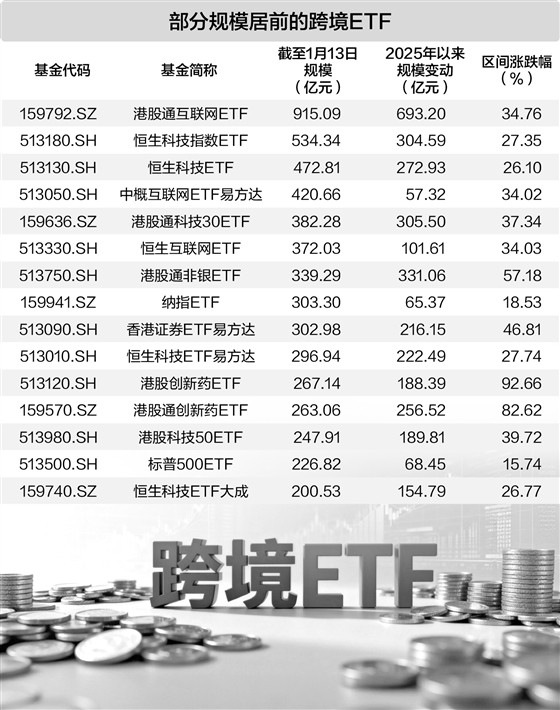 证券时报记者 赵梦桥 随着全球资本市场共振上涨,资金对海外市场的热情也助推跨境ETF规模持续攀新高。据统计,截至1月13日,跨境ETF规模总量达到10098亿元人民币,这也是其历史上首次突破万亿元大关。 拉长时间来看,2025年初跨境ETF规模为4242亿元,这意味着一年多的时间里,这类产品的总体规模增幅高达138%。在席卷全球的人工智能和创新药投资热潮下,多个主要市场在去年创下历史新高。因额度限制,资金的涌入也使得多只跨境ETF二级市场面临溢价,限购亦成为QDII基金的共有“标签”。 跨境ETF规模突破万亿 具体来看,富国基金旗下港股通互联网ETF规模领跑,截至1月13日,该基金规模高达915.09亿元,其次是华夏恒生科技指数ETF,规模约为534.34亿元。此外,华泰柏瑞基金和易方达基金旗下2只产品规模均超过400亿元。整体来看,共有25只跨境ETF规模超百亿元,而在去年初,规模超百亿元的跨境ETF只有11只。 今年来看,自2026年开年以来,跨境ETF规模在不足半个月的时间里增加了600多亿元,最新规模已达到10098亿元。 从投向来看,跨境ETF覆盖的区域包括美国、韩国、沙特等多个市场,但无论是产品数量和规模均以港股为主,份额超百亿的产品中,仅有国泰基金、景顺长城基金、华夏基金和嘉实基金旗下4只纳指ETF,其余基金多为恒生科技、创新药以及非银金融等港股主题产品。 规模的跃升既缘于投资者的追捧,也缘于QDII市场良好的业绩表现。2025年包括美国、日本、德国等多个市场创下历史新高,连带相关基金表现不俗。 2025年,全市场650只(各类份额分开计算)有可比业绩的QDII基金中,619只基金净值上涨,占比95.2%。受益于人工智能和创新药等板块出现全球性上涨,重仓创新药板块的汇添富香港优势精选和创金合信全球医药生物,以及重仓台积电、英伟达等科技巨头的易方达全球成长精选领跑QDII业绩排行榜。此外,嘉实德国DAX ETF、华夏野村日经225ETF以及多只纳斯达克ETF均有两位数涨幅。 溢价和限购频现 公开数据显示,截至2025年底,国家外汇管理局累计批准的QDII额度已达1708.69亿美元,其中证券基金类额度为942.9亿美元,但额度依旧“吃紧”,基民对QDII的热忱还常体现在产品频繁出现溢价。 截至2026年1月14日,景顺长城纳斯达克科技市值加权ETF溢价率高达19.28%。此外,博时标普500ETF、国泰纳斯达克100ETF等基金二级市场溢价率超过5%。 1月13日晚间,汇添富基金旗下纳斯达克100ETF发布溢价风险提示公告称,二级市场交易价格明显高于基金份额参考净值,出现较大幅度溢价,投资者如果盲目投资,可能遭受损失。1月12日,投向纳斯达克100、纳指科技、标普500、中韩半导体、日经225等指数的多只产品,也发布了溢价风险提示。 ETF产生溢价的根本原因是短期二级市场供不应求,每次导致供不应求的触发因素不同,如抄底需求、资产表现差异等。“通过场内交易高溢价QDII基金进行海外资产配置,并非理想选择。”有公募观察人士表示,“高溢价基金存在显著的回落风险。一旦市场情绪发生逆转,场外申购额度有所放宽,溢价率可能迅速下降。” 除了ETF以外,多只主动型QDII基金也收紧了申购通道。截至1月14日,华宝海外科技单日申购上限仅有10元,嘉实全球互联网人民币、广发纳斯达克生物科技A人民币以及国富全球科技互联人民币等多只基金申购上限为100元。 港股和美股仍被看好 近期,多名基金经理展望QDII投资机遇时,均对2026年港股投资机遇保持乐观。 华夏基金基金经理徐猛认为,港股是外资投向中国资产的“桥头堡”,与海外流动性相关性较高。此外,美联储2025年9月开启新一轮降息周期,多重信号显示,2026年宽松大趋势仍将继续。因此在中美宽松周期共振下,徐猛认为港股流动性有望保持充沛。 具体到板块,徐猛更看好港股科技板块的基本面。“港股科技板块汇聚国产AI核心资产,涵盖算力、模型、软件应用和硬件终端等全产业链龙头企业;不仅如此,国内参与全球AI竞争的互联网大厂在资本开支、上下游布局方面若有跟进动作,有望催化新一轮科技行情。”徐猛表示,DeepSeek的出现推动中国科技企业在全球竞争优势中重新定位,信心和观念的重塑将推动国内外投资者重新审视中国的投资机会。因此,中美科技股估值差有望收敛,估值中枢有望上移。 景顺长城基金基金经理金潢认为,港股投资机会上,短期继续看好受益于利率下行的红利资产,中期侧重景气投资和需求侧变化,关注科技和消费。首先,随着人工智能算力提升和相关应用加速落地,AI赋能的细分领域值得重点关注。其次,基于需求侧变化,继续关注国内经济复苏及提振内需消费的政策利好落地的受益机会,在日常消费和可选消费方面,包括情绪消费、AI消费、养老育幼消费以及高性价比消费等。 对于美股后市机会,有机构表示,AI的影响正在扩大到科技以外的领域,如医疗保健和金融。企业盈利是推动股票表现的关键,预计标普500指数的每股收益将在2026年再增长10%,这将继续支撑股市涨势。 |