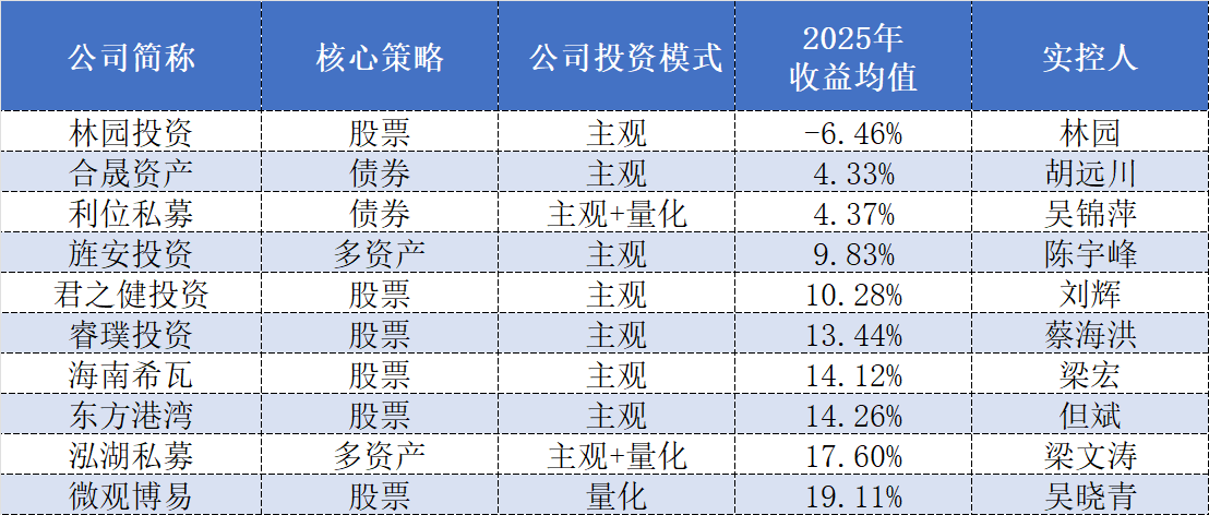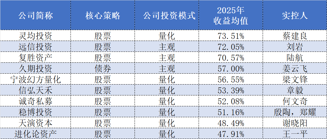 量化巨头灵均投资以高达73.51%的收益均值,成为2025年百亿私募收益总冠军。 灵均投资成立于2014年6月,公司董事长蔡枚杰曾就职于中金公司、鹏华基金、浙商基金;首席投资官马志宇曾供职于美国著名对冲基金千禧年基金(Millennium Partners)旗下世坤投资(WorldQuant),历任全球研究副总监、中国区副总经理、中国区研究总监等。根据官网介绍,该公司的管理规模在2018年突破100亿元,随后几年继续高歌猛进,至2022年一度超过600亿元。 近年来,灵均投资的发展曾一度受挫。2024年2月,公司因旗下产品异常交易被沪深交易所暂停相关账户交易,同年3月被沪深交易所予以公开谴责。中基协数据显示,灵均投资曾在2023年12月至2025年2月连续15个月没有备案新产品,直到2025年3月才重启产品备案,2025年全年一共备案10只新产品。 主观类百亿私募远信投资和复胜资产分列第二和第三位,旗下产品2025年的收益均值分别高达72.05%和70.57%。 远信投资成立于2014年9月,根据第三方平台统计数据,2025年年初,该公司的管理规模曾一度滑落至50-100亿元区间,不过同年10月公司又重返百亿私募之列。中基协数据显示,2025年全年该公司一共备案9只新产品。 与量化私募极度分散化投资不同的是,主观类私募的投资方向往往相对集中。界面新闻注意到,远信投资曾在2025年12月发布的文章中提及:“过去几年,我们把能力圈更聚焦在科技、高端制造、新能源、智能汽车、机器人等新兴领域以及新兴消费,这些我们认为是当下以及未来的核心资产上。”结合A股市场行情来看,对于相关方向的精准布局,或是远信投资2025年业绩表现亮丽的重要原因所在。 复胜资产成立于2015年12月,根据第三方平台数据,近年来公司的管理规模曾一度有所回落,不过2025年6月后又重新回到100亿元以上。 2025年下半年以来,复胜资产继续快速“扩张”。中基协数据显示,复胜资产2025年累计备案21只新产品,占公司成立以来备案产品总数的25.61%,其中19只产品的备案时间集中在2025年下半年。另据媒体报道,今年1月9日,复胜资产通过招商银行私人银行渠道发行的主动股票私募产品,单日完成10亿元募资并售罄,成为年内首个“日光”私募爆款。 在2025年年底发布的文章中,复胜投资回顾了公司该年度的调仓动向表示:“沿着‘女性消费者红利’这个大的时代背景,我们把握了年初港股新消费龙头公司的投资机会,并在年中继续深挖,又切换到了如零食零售、游戏等其他环节。”复胜投资同时提到,展望2026年,‘新消费’依然是公司核心关注方向,有色金属以及一些传统行业也是公司目前布局和投资的方向,至于投资者都高度关心的AI科技方向,公司一直都有关注,主要关注点偏向下游应用。 另一家主观类百亿私募久期投资排名第四,旗下产品2025年的收益均值为57%,该公司也是2025年百亿私募收益前十强榜单中唯一以债券策略为核心的私募。 在近日发布的2026年1月资产配置月报中,久期投资提到:“债券方面,在经历了一个月的调整以后,部分品种估值出现修复,但是整体是一个分化的格局,在组合应对方面,采用中低久期,票息策略为主,久期策略采用打猎思路。可转债方面,鉴于极贵的估值,总体投资会较为谨慎。从个体出发,尽可能从债性保护开始投资。如有短久期、促转股意愿较强、在反内卷主题相关行业的公司转债,单独考量。” 此外,百亿量化私募中的宁波幻方量化、信弘天禾、诚奇私募、稳博投资旗下产品2025年的收益均值也都超过了50%,分别排在第五至第八位;天演资本、进化论资产也均“榜上有名”,旗下产品2025年的收益均值也分别达到48.49%和47.91%。 也有部分百亿私募2025年的收益表现不尽如人意。其中,排在后十位的百亿私募2025年的收益均值均不足20%,按照投资模式划分,有7家为主观私募,2家为主观+量化私募,仅1家为量化私募。 林园投资以-6.46%的收益均值在纳入统计范围内的57家百亿私募中排名垫底,也是其中唯一一家在2025年度录得负收益的百亿私募;以债券策略为核心的合晟资产和利位私募旗下产品2025年的收益均值也分别仅为4.33%和4.37%,排在倒数第二和第三位。 此外,旌安投资、君之健投资、睿璞投资、海南希瓦、东方港湾、泓湖私募等旗下产品2025年的收益均值也都未能跑赢该年度沪深300指数的涨幅17.66%。
