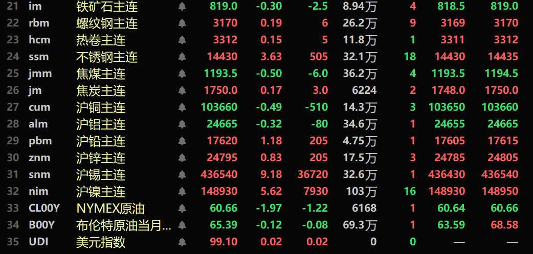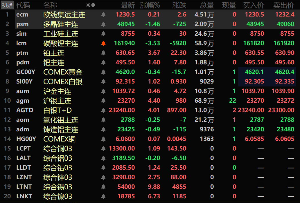 SMM1月15日讯: 金属市场方面: 隔夜内盘基本金属普涨。沪铜跌0.49%。沪铝跌0.32%,沪铅涨1.18%。沪锌涨0.83%。沪锡涨9.18%,盘中刷新历史新高至443380元/吨。沪镍涨5.62%。此外,氧化铝主力期货跌0.25%,铸造铝主连涨0.49%。 隔夜黑色系多飘红,铁矿跌0.3%,不锈钢涨3.63%,螺纹钢涨0.19%,热卷涨0.15%。双焦方面:焦煤跌0.5%,焦炭涨0.17%。 隔夜外盘金属方面,LME基本金属普涨。伦镍涨6.73%,伦铜涨1.09%,盘中刷新历史新高至13407美元/吨。伦铝跌0.2%,伦锌涨2.75%。伦铅涨1.24%。伦锡涨9.88%,盘中刷新历史新高至54760美元/吨。 隔夜贵金属方面:COMEX黄金涨0.76%,盘中刷新历史新高至4650.5美元/盎司;隔夜COMEX白银涨7.93%,1月15日盘中刷新历史新高至93.7美元/盎司。内盘贵金属方面:沪金主连涨0.46%,盘中刷新历史新高至1042.94元/克;沪银主连涨4.4%,盘中刷新历史新高至23688元/千克。 截至1月15日8:15分,隔夜收盘行情: