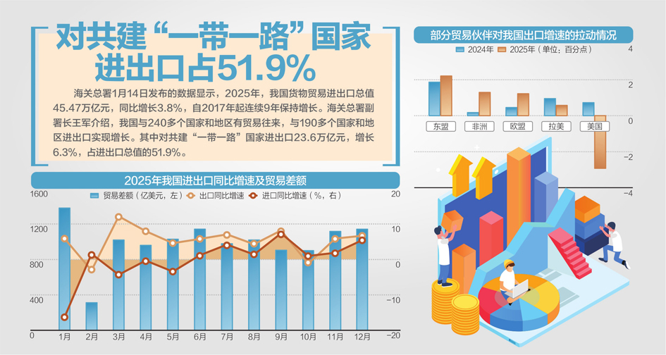 1月14日,国新办举行新闻发布会,介绍2025年全年进出口情况。 海关总署副署长王军在现场介绍,我国2025年全年进出口总值45.47万亿元,同比增长3.8%,创历史新高,将继续保持全球货物贸易第一大国地位。