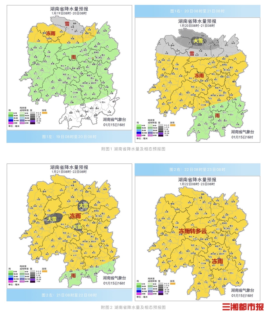 华声在线1月16日讯(全媒体记者 李致远 通讯员 曾彦彦)1月16日,记者从湖南省气象台获悉,1月19日至22日湖南将出现今年首场寒潮和低温雨雪冰冻天气过程。平均气温下降10~16℃,22日夜间至23日清晨最低气温将降至-5~-1℃(高海拔地区-8℃左右),最高气温降至-1~1℃,局地阵风9~11级;全省大部分地区将出现冻雨或冰粒,湘中以北局地大雪,湘西南积冰厚度可达5~10毫米。需重点防范低温雨雪冰冻及大风降温对交通运输、城市运行、能源保供、农业生产、人体健康等的影响。 省气象台副台长王青霞告诉记者,预计本次过程的雨雪强度不及2024年初的三次过程,但冻雨范围更广。与今年元旦期间的雨雪过程相比,本次过程雨雪范围更大、冻雨影响更广、低温持续时间更长。