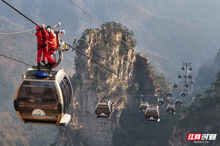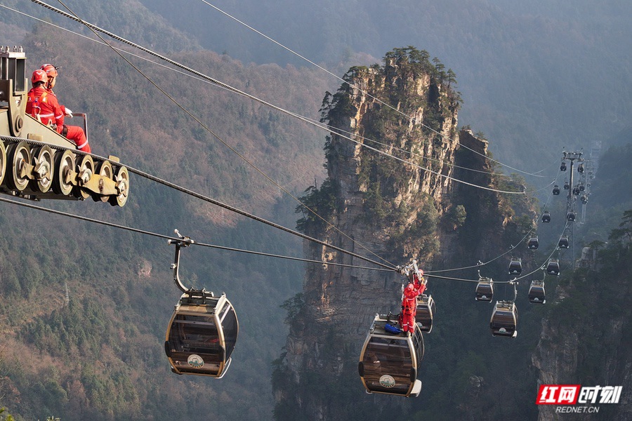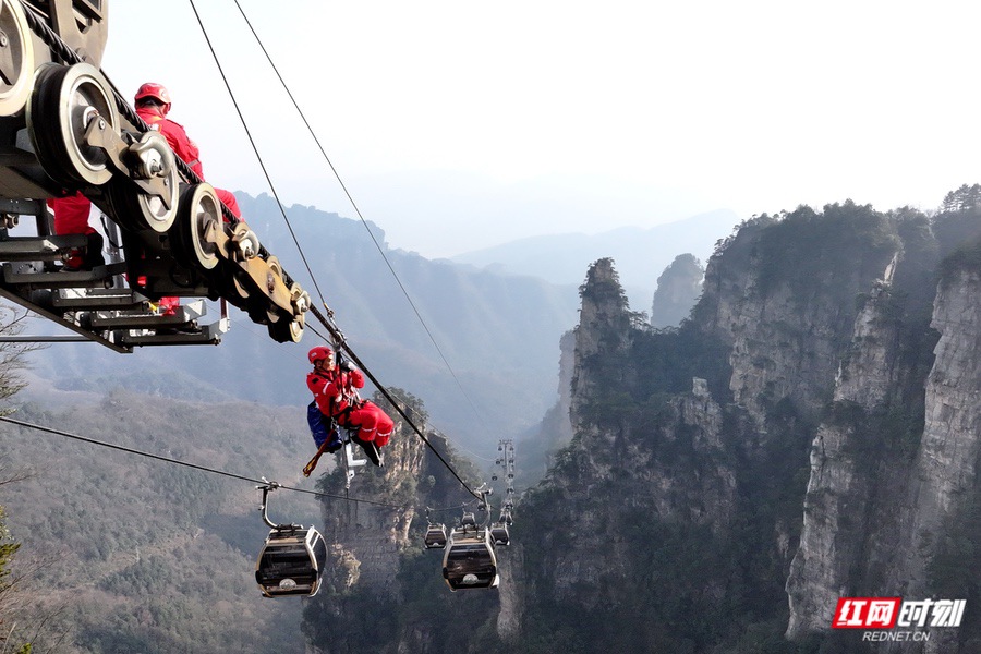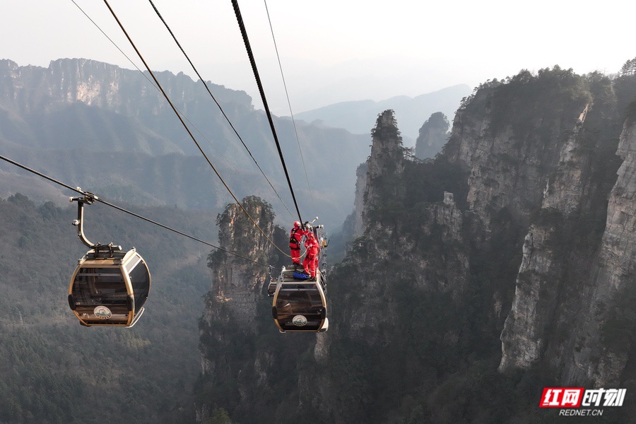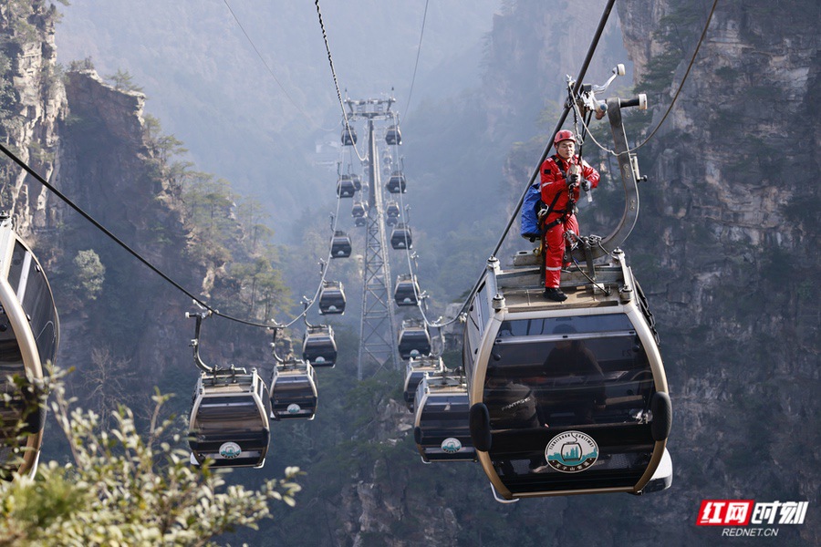 张家界国家森林公园在天子山索道开展冬季高空救援模拟演练。