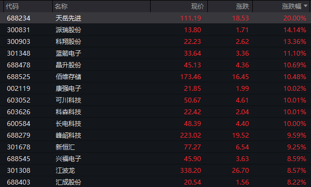 又有个股走出“地天板”走势。 A股市场今天(1月16日)上午窄幅震荡,电子板块领涨,成为上午市场主要亮点之一,该板块多股涨停或涨幅超过10%。 热门个股方面,近期商业航天板块的大牛股*ST铖昌(001270)今日开盘跌停,随后1分钟内强势拉升涨停,走出“地天板”走势。 港股市场恒生指数今天上午明显高开,后收窄涨幅。港股通标的股中,德林控股大涨,盘中涨幅超过26%。 A股电子板块领涨 A股市场今天上午窄幅震荡,主要指数波动幅度不大。截至中午收盘,上证指数下跌0.22%,深证成指下跌0.10%,创业板指下跌0.01%。 行业板块方面 ,若按照申万一级行业划分,电子板块领涨,板块盘中涨幅超过2%,该板块中包含多只芯片股。天岳先进盘中“20cm”涨停,派瑞股份、科翔股份、晶升股份、蓝箭电子、佰维存储等多股盘中涨幅超过10%。康强电子、可川科技等多股盘中涨停,另有多股跟涨。