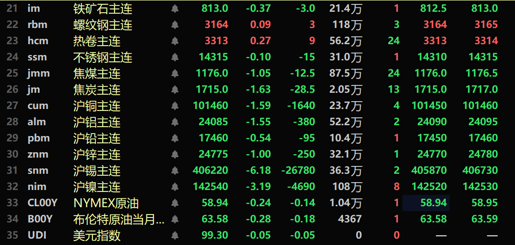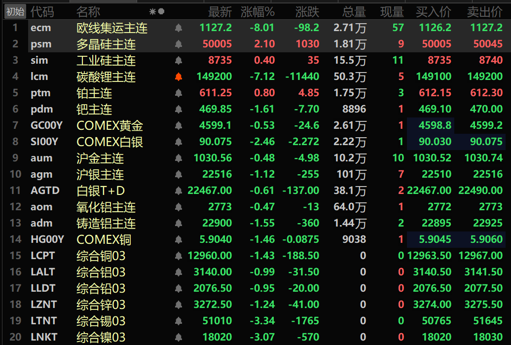 SMM1月16日讯: 金属市场方面: 截至午间收盘,内盘基本金属全线走弱,沪铜跌1.59%。沪铝跌1.55%。沪铅跌0.54%,沪锌跌1%。沪锡跌6.18%。沪镍跌3.19%。 此外,铸造铝主连期货跌1.55%,氧化铝主连跌0.47%。碳酸锂主连跌7.12%。工业硅主连涨0.4%。多晶硅主连涨2.1%。 黑色系多飘绿,铁矿跌0.37%,螺纹微涨0.09%,热卷涨0.27%,不锈钢跌0.1%。双焦方面:焦煤主力合约跌1.05%,焦炭主力合约跌1.63%。 外盘基本金属方面,截至11:38分,LME金属全线下跌。伦铜跌1.43%。伦铝跌0.99%。伦铅跌0.95%。伦锌跌1.24%。伦锡跌3.34%。伦镍跌3.07%。 贵金属方面,截至11:38分,COMEX黄金跌0.53%;COMEX白银跌2.46%。内盘贵金属方面:沪金主连跌0.48%;沪银主连跌1.12%。 此外,截至午间收盘,铂主连期货涨0.8%,钯主连期货跌1.61%。 截至午间收盘,欧线集运主力合约跌8.01%,报1127.2点。 截至1月16日11:38分,部分期货午间行情: