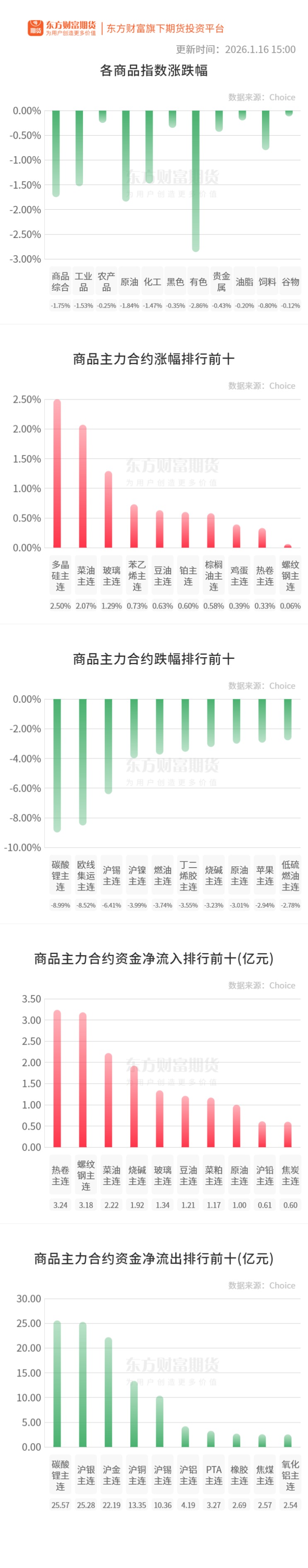 行情纵览![]() 宏观产经财联社:周四,多位美联储官员发表讲话,暗示愿意在即将召开的货币政策会议上暂停降息,理由是劳动力市场似乎已趋于稳定,且通胀压力仍在持续;近期在政策辩论中立场存在分歧的五位地区联储银行行长均表示,美联储目前处于有利位置,应等待更多数据出炉后再采取进一步行动。 中国人民银行:央行今日开展867亿元7天逆回购操作,操作利率为1.40%,与此前持平。 外交部:外交部发言人宣布:应世界经济论坛和瑞士联邦政府邀请,中共中央政治局委员、国务院副总理何立峰将于1月19日至22日赴瑞士达沃斯出席世界经济论坛2026年年会并访问瑞士。 品种资讯黑色系期货 钢材:本周钢厂盈利率升至39.83%,对原燃料补库积极性增加,炼焦煤、废钢等价格不同程度上涨,铁矿石高位震荡。17日至21日,受寒潮影响,我国大部地区气温将普遍下降6~10℃。预期下周钢材需求走弱,钢市供需呈现双弱格局,原燃料价格或难继续冲高。短期来看,钢价或延续震荡运行。(我的钢铁网) 焦煤:1月16日蒙古国ETT公司炼焦煤进行线上竞拍,1/3焦原煤A9,V28-37,S1.0,G75,Mt5起拍价88美元/吨,挂牌数量12.8万吨全部成交,成交价格98.2美元/吨,较昨日上涨4.2美元/吨,以上价格均不含税。供货地点为甘其毛都口岸海关监管区,供货时间为付款后74天内,最后供应日期为2026年3月31日。(我的钢铁网) 农产品期货 棕榈油:南部半岛棕榈油压榨商协会(SPPOMA)数据显示,2026年1月1日-15日马来西亚棕榈油单产环比前一月同期减少18.09%,出油率环比减少0.03%,产量环比减少18.24%。(新华财经) 生猪:据农业农村部监测,截至1月16日14:00时,全国农产品批发市场猪肉平均价格为18.07元/公斤,较前一日上升0.4%;鸡蛋平均价格为7.80元/公斤,较前一日下降0.1%。(我的钢铁网) 有色/贵金属期货 碳酸锂:据Mysteel数据显示,今日MMLC电池级碳酸锂(早盘)价格较昨日下跌1800元/吨,中间价报156250元/吨。(我的钢铁网) 沪铜:在媒体近日指出英伟达此前提出的铜需求预期值存在错误后,英伟达方面已悄然修改该数据,外界对人工智能数据中心的铜需求可能需要重估。据英伟达官网去年刊登的一份技术论文指出,一个容量在一吉瓦的传统数据中心机架,需要高达50万吨铜母线,这引起外界对未来铜的供需形势大为担忧。不过,近期有细心的观察者发现,该论文的结论存在明显的计算错误,实际上一吉瓦数据中心仅需要200多吨铜,差不多相当于50万磅,可能是该论文用错了单位。(财联社) 沪镍:2026年1月16日金川集团电解镍Ni9996上海报价154300元/吨,金昌报价153800元/吨,佛山报价154600元/吨,较上一交易日上涨1000,金川集团上海市场销售价格折算沪镍2602合约10:15盘面升贴水为+9430元/吨。(我的钢铁网) 能化期货 丁二烯胶:上海市场高顺顺丁橡胶较上一工作日收盘区间下挫50-100元/吨,现货报盘重心下挫,成交跟进偏弱势,实单商谈。(隆众资讯) 尿素:山东地区尿素行情稳中小涨,小颗粒主流出厂成交1710-1760元/吨,大颗粒出厂参考1880-1900元/吨。临沂市场一手贸易商出货参考价格1760-1770元/吨附近,菏泽市场参考价格1740-1750元/吨附近。省内企业生产基本正常。近两日情绪波动,市场成交氛围下降,厂家新单成交明显不及前日,但短时出货无压,报价还在坚挺小涨继续。不过市场跟进放缓,工业谨慎为主,农业部分还有适量走货,市场行情短时僵持运行。(隆众资讯) 晚间关注无 (文章来源:东方财富研究中心) |