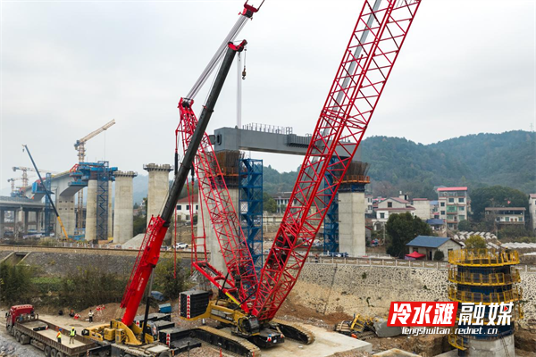邵永高铁跨芦洪江特大桥施工现场(雷中祥 摄) 跨芦洪江特大桥全长3050.955米,需跨越高速、铁路、省道及河流,是邵永高铁全线的重点难点工程之一。此次架设的钢盖梁位于26号墩段,采用26米跨度门式墩构造跨越既有益湛铁路,吊装重量达209.8吨,具有吊装吨位大、作业半径广、吊装高度高、施工时间紧、施工难度大、安全风险高的特点。建设单位通过开展安全风险研判、设计优化和技术交底,最终采用650吨履带吊起钢盖梁,逆时针旋转117度后,与门式墩精准对位,一次性顺利完成吊装作业。