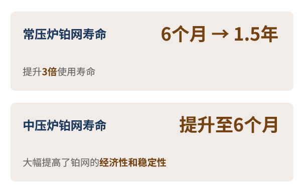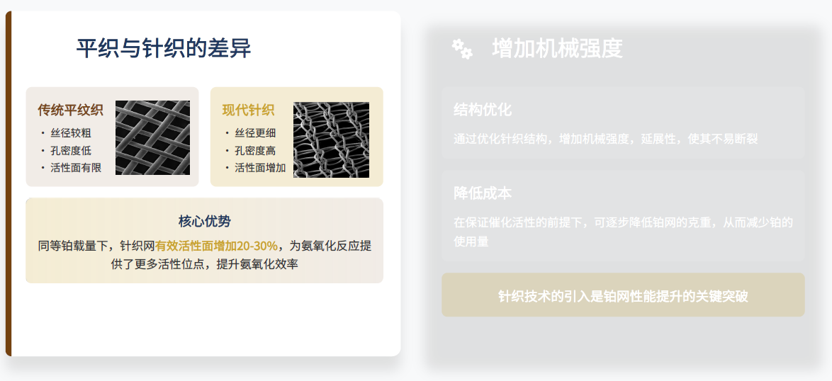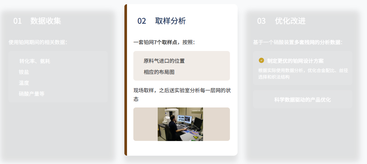 其对铂网演变的历程进行了介绍。 变化:贵金属填充量减少 ►改进 1.贵金属分布更合理:通过多功能反应层设计,优化贵金属在铂网中的分布,提高利用率; 2.贵金属用量降低:在保证催化效果的前提下,显著减少贵金属填充量,降低生产成本; 3.铂网的转化率提高:优化的结构设计提升了氨氧化转化率,达到更高的硝酸产量。 ►环保效益 铂网的贵金属消耗降低:通过优化设计和回收技术,减少贵金属损耗,提升经济性。 NOx和N₂O排放降低:优化催化反应过程,减少有害气体排放,符合环保要求。 ►Eco-Cat套网技术实现了经济效益与环保效益的双赢。 改进的依据:残网分析