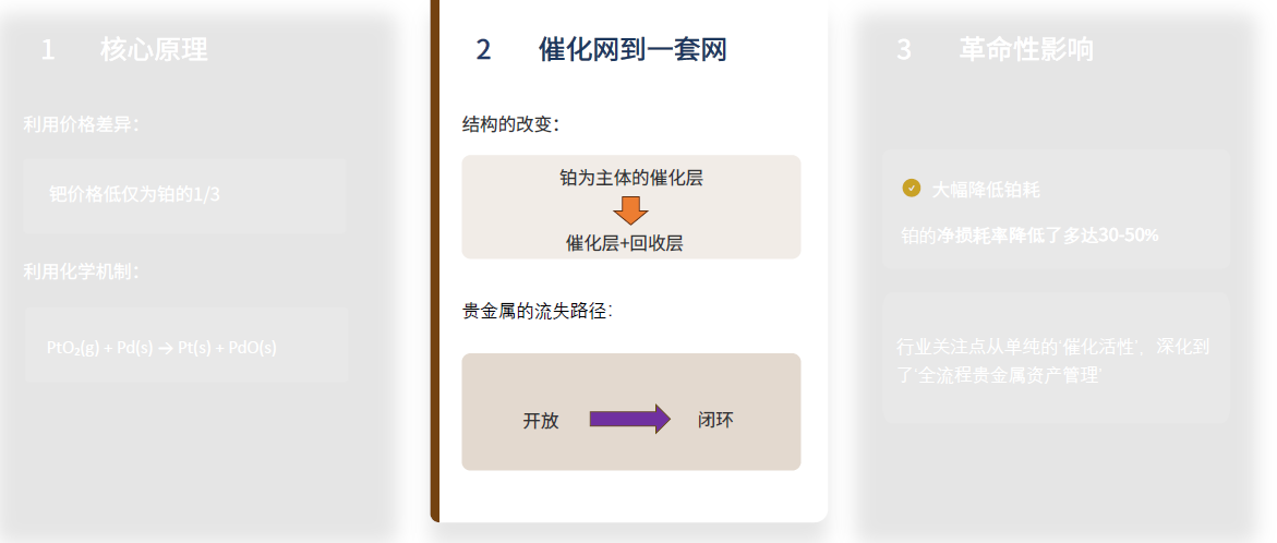 多元合金时代:Pt-Rh-Pd协同合作 ►多元合金的优势 近三十年来,Pt-Pd-Rh三元合金逐渐成熟并广泛应用。 Pd的引入带来多重优势:降低了原料成本,协同其他元素进一步抑制高温挥发损失,提升铂网的经济性和稳定性。 ►性能提升数据