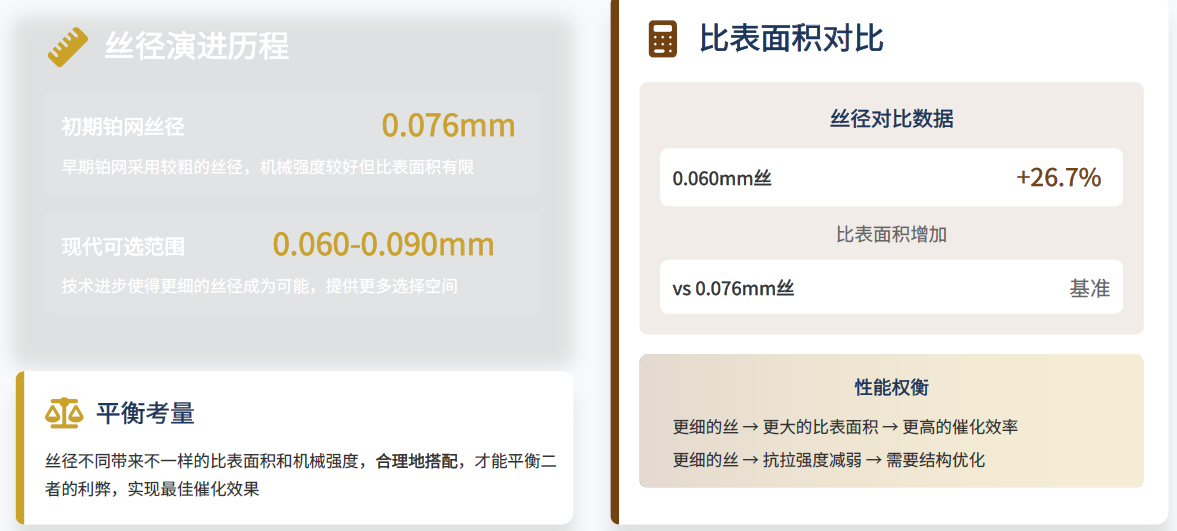 针织的演变 其结合Nitro Lok 1×1 的织法(基础针织结构,提供稳定的催化性能),Pro Lok 1×2 的织法(改进的针织结构,提升催化效率),Hi Lok 1×3 的织法(优化的针织结构,最⼤化催化活性)等织法以及针织技术演进趋势等进行了介绍。 丝径选择 增大比表面积 丝径优化与性能平衡 丝径变化