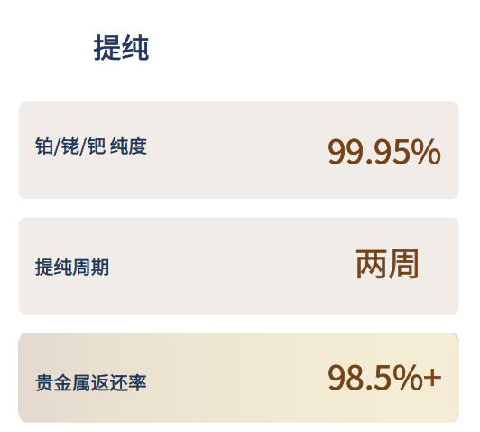 其从数据收集、取样分析以及优化改进等角度进行了分析。 残网回收 湿法精炼变废为宝 资源循环利用体系 铂网贵金属循环 生产:铂网催化剂生产制造;使用:硝酸生产中的催化应用;回收:残网湿法精炼回收贵金属。 完整的贵⾦属循环产业链:铂⽹⽣产(制造催化剂)→硝酸⽣产(催化应⽤)→残⽹回收(精炼再利⽤)。 残网回收:湿法精炼工艺 ►湿法精炼技术 工艺优势:采用环保湿法工艺;回收率高,贵金属损耗低;减少环境污染。 回收流程:残网收集 → 预处理 → 溶解 → 分离提纯 → 贵金属回收。 ►提纯