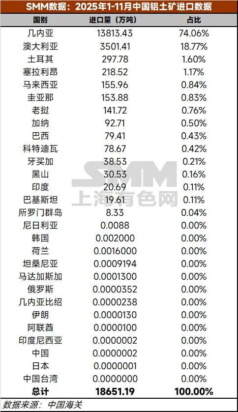 几内亚矿业商会(CMG)是该国矿业领域最具代表性的专业组织,汇聚了80余家会员企业,涵盖国际矿企经营者、本土公司、勘探企业以及矿业价值链上的关键服务提供商。 商会致力于推动负责任、可持续且包容性的矿山开采,同时支持经济增长、地方发展和投资便利化。CMG与公共机构、国际组织和私营部门伙伴紧密合作,以提升行业治理水平、透明度和竞争力。 当前工作重点包括气候与生物多样性项目、关键矿物战略制定、产能建设、女性经济赋权及国际合作。通过参与全球论坛和经济使团活动,CMG积极将几内亚打造为非洲首选的矿业投资目的地,促进长期互利伙伴关系。 为什么几内亚如此关键 作为全球最大的铝土矿资源国,几内亚铝土矿储量约 74 亿吨,占全球总储量 25% 以上。几内亚的选择,正在深刻影响全球铝产业链。对中国企业而言,这种影响尤为直接。 中国是全球最大的铝土矿进口国,而其中超过三分之二的供应,来自几内亚。 2024 年中国铝土矿进口量约 1.59 亿吨,其中约 69.5%(约 1.1 亿吨)来自几内亚。 进入 2025 年,这一集中度仍在上升。2025 年 1–11 月,中国自几内亚累计进口铝土矿 1.38 亿吨,同比增长 38.25%,占总进口量 74.06%。