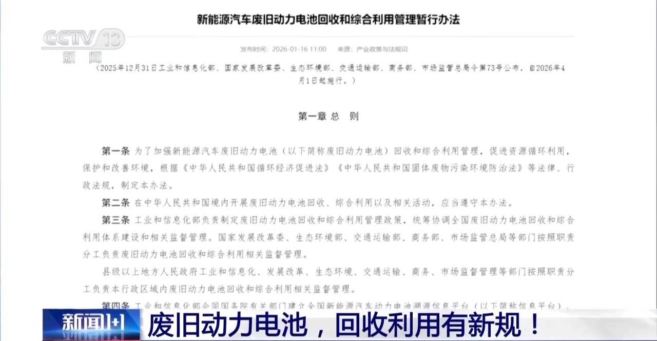 2025年新能源汽车的产销双双突破了1600万,同时新能源汽车废旧动力电池综合利用量超过了40万吨,五年后这个总量可能会超过100万吨。目前最早一批新能源汽车搭载的动力电池逐步进入到规模化“退役”阶段,我们的废旧动力电池回收和利用体系准备好了吗?1月16日,工信部联合6部门发布了《关于新能源汽车废旧电池回收和综合利用的管理办法》,它直击当下该行业的哪些痛点,会给我们回收利用的产业和企业带来怎样的影响。 新规有哪些特点、亮点 当我国新能源汽车产业快速发展时,越来越多的新能源汽车动力电池,即将进入动力电池规模化退役阶段。据测算,2030年当年的废旧动力电池产生量将超过100万吨。