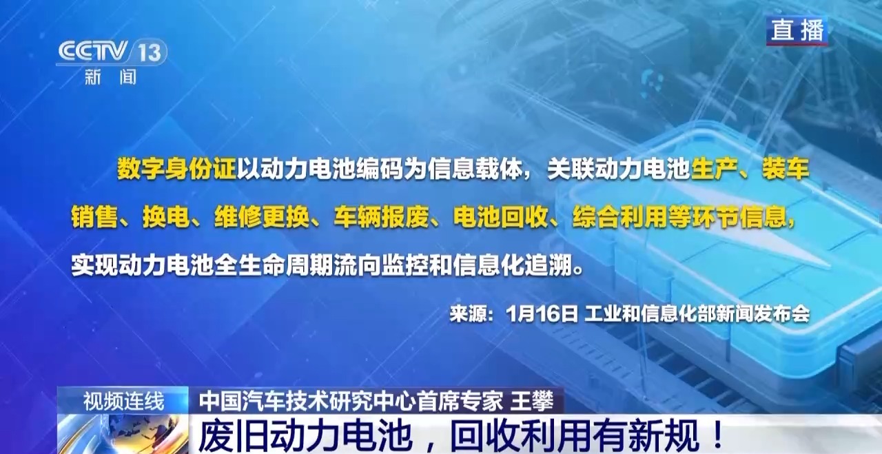 有了数字身份证后,在国家的溯源平台上,可以有一定权限去开放数字身份证查询的功能,比如后端的一些动力电池的综合利用企业通过查询电池的数字身份证,可以了解电池的一些拆卸、拆解的技术信息,有利于更高效地进行拆解,从而提高综合利用水平,对整个产业链上下游的协同有非常好的意义。 不再使用“梯次利用” 对相关企业有何影响 中国汽车技术研究中心首席专家 王攀:对于“梯次利用”,当前的《管理办法》不再提这个概念了。首先在电动自行车、电动平衡车,包括一百度电以上的储能系统等应用领域,已经有明确出台的强制性产品标准,明确表明了禁止使用“梯次利用”的电池产品。这些做法、规定一定程度上压减了“梯次利用”的空间,但也是出于对未来产品安全方面的考虑。 但是从事相关的企业也可以在比如远离人群、安全要求不是很高的应用领域去探索这方面的应用,比如在户外、通信的备用电源等领域去应用。 各省份建立回收体系需注意什么 中国汽车技术研究中心首席专家 王攀:现在各个省份都在建立自身的回收体系,其实在这个过程中,各个省份需要注意统筹协调的问题,避免重复建设带来的资源浪费。我们更加鼓励回收服务网点的共建共享模式的落地。同时在网络建设的数量上有所保证,整个回收服务网点建设包括运营的规范性,即从质量的角度上也要有所保证,要求生产者切实落实好自己的生产者责任延伸,把所设立的回收服务网点的建设、运营的规范性提升上来。 从政府主管部门来讲,要落实事后监管,让整个回收体系更加规范。 还有一点,因为各个省份、各个区域整个新能源汽车产业的发展程度是不同的,整个回收服务网络的建设也要结合当地的新能源汽车保有量,以及未来电池退役的时空分布等,综合考虑多方面因素,科学布局回收网络的建设,达到更加高效的回收。 如何看待新规监管的约束力 中国汽车技术研究中心首席专家 王攀:《管理办法》也提到,如果出现违反《管理办法》相关规定的行为,相关企业会面临比如责令整改、罚款、警告等处罚。如果有些行为涉及刑事犯罪,可能也会受到刑事方面的惩处。 所以在整个监管的力度、约束力上还是非常强的,当然在这个过程中要充分重视多部委联合监管,在联合执法的过程中,怎样才能更好地落地。此外,建设全国的动力电池溯源信息平台实际上也打造了一个融会贯通的数据体系,有了这个基础,也是为未来的联合监管落地提供更好的保障。 责编:欧小雷 一审:欧小雷 二审:印奕帆 三审:谭登 来源:央视新闻客户端 |
