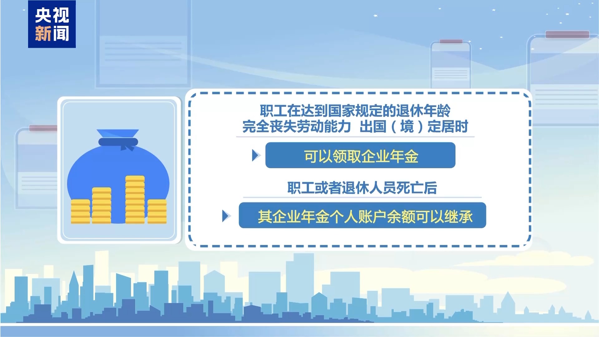 职工在达到国家规定的退休年龄、完全丧失劳动能力、出国出境定居时,可以领取企业年金;职工或者退休人员死亡后,其企业年金个人账户余额可以继承。 我国多层次养老保险体系的“三支柱” 我国多层次养老保险体系主要包括“三支柱”。 第一支柱为基本养老保险,包括城镇职工基本养老保险和城乡居民基本养老保险,目前覆盖人数超过10亿人。 第二支柱为企业年金、职业年金,由用人单位及其职工建立,主要发挥补充作用。 第三支柱为个人储蓄性养老保险和商业养老保险,具体包括个人养老金和其他个人商业养老金融业务两个部分。 截至2025年三季度,全国建立企业年金的用人单位17.5万户,参加职工3332.05万人,积累基金4.09万亿元。