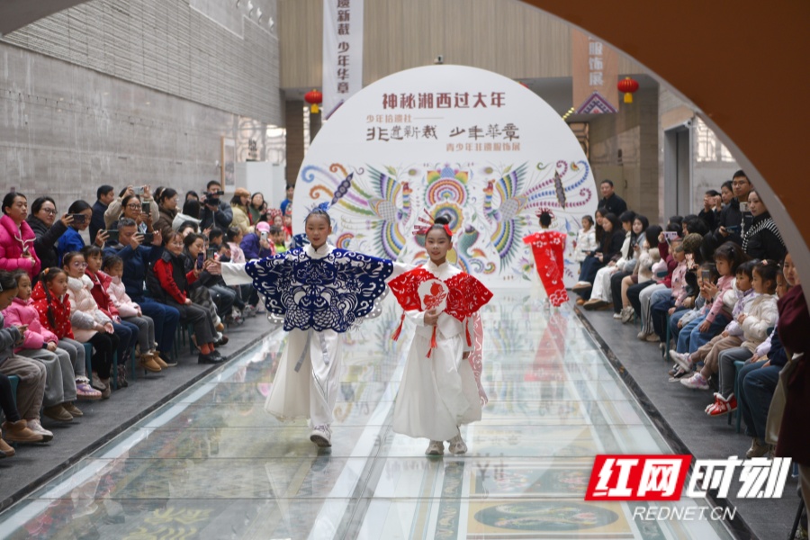 “非遗新裁·少年华章”青少年非遗服装秀现场。 红网时刻新闻1月18日讯(记者 胡邦建 通讯员 吴施)1月17日,由湘西州博物馆(非遗馆)主办的“神秘湘西过大年”湘西州博物馆(非遗馆)新春文化体验季活动正式启动,现场通过展览、展演、互动体验等多种形式,集中呈现湘西非遗的独特魅力,为市民和游客献上了一场富有地域特色的文化盛宴。 当天,湘西州博物馆(非遗馆)内,多项年味十足的活动同步开展,吸引了众多观众积极参与。 “非遗新裁·少年华章”青少年非遗服装秀是一大亮点。一件件由青少年设计创作,融合传统工艺与现代设计理念的非遗服饰惊艳亮相,展现了非遗在青少年手中的创新与表达。