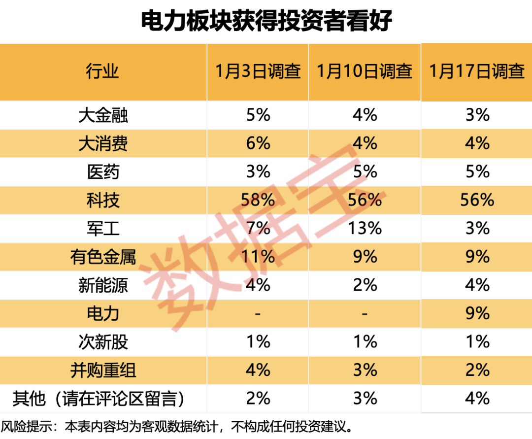从板块来看,科技板块看好率维持高位,56%的受访者表示看好。受消息面“‘十五五’时期,国家电网公司固定资产投资预计达到4万亿元”的提振,新增加的“电力”板块获得投资者青睐,占比达9%。 从概念角度来看,存储芯片、人工智能、商业航天/卫星互联网最被看好,占比依次为25%、17%、13%。