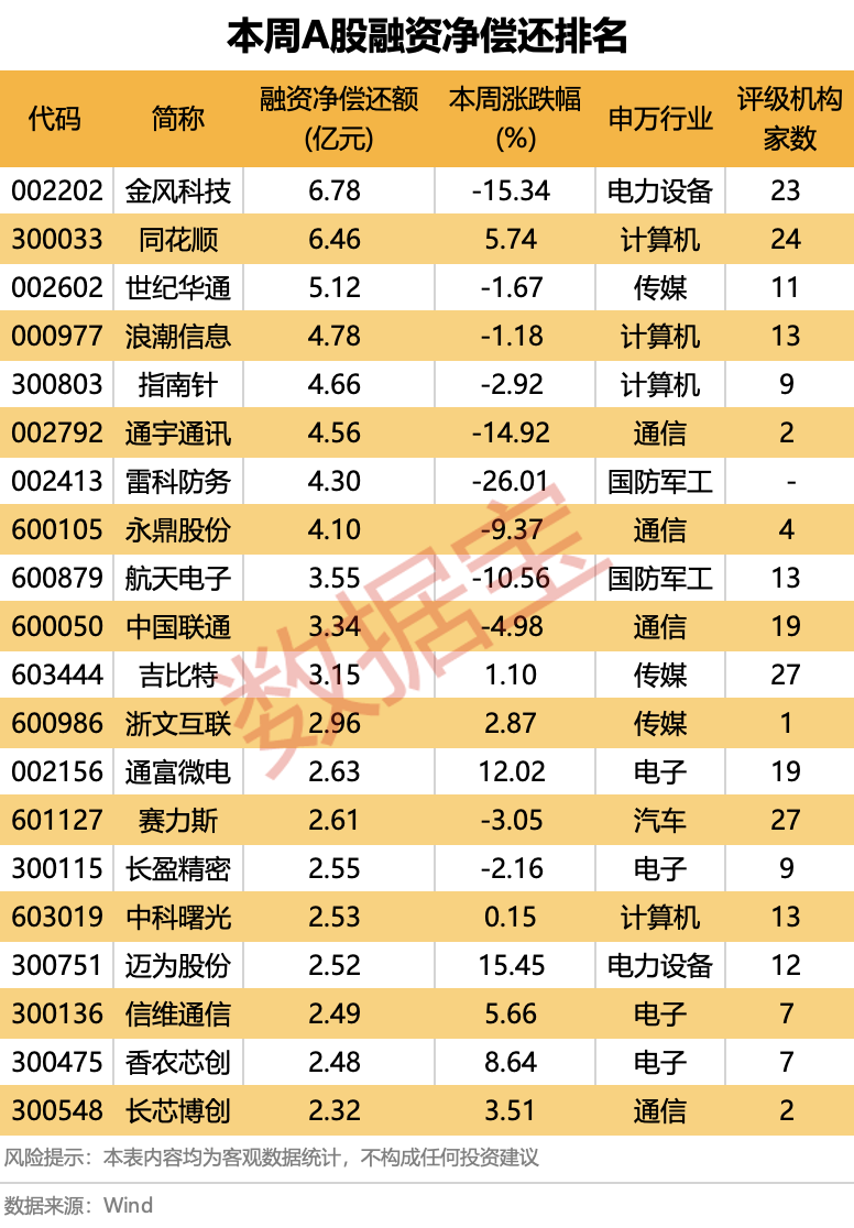 85股融资净偿还额超过1亿元。金风科技、同花顺、世纪华通排名前三,融资净偿还额依次为6.78亿元、6.46亿元、5.12亿元;浪潮信息、指南针、通宇通讯、雷科防务、永鼎股份等融资净偿还均在4亿元以上。 金风科技融资净偿还金额居首。公司为国内风电龙头企业,近期因通过全资子公司持有蓝箭航天14908382股,对应4.1412%股份,而搭上“商业航天”的概念。金风科技表示,对蓝箭航天的持股作为非上市权益工具的投资,作为公司其他非流动金融资产在报告中披露。 该股一度走出11天7板走势,近两日则连续跌停。1月15日,游资陈小群(中国银河证券大连黄河路证券营业部)现身卖一席位,净卖出额1.92亿元。 前期走势强势的商业航天股雷科防务、航天电子以及游戏板块的世纪华通、吉比特均遭到融资资金3亿元以上的净偿还。