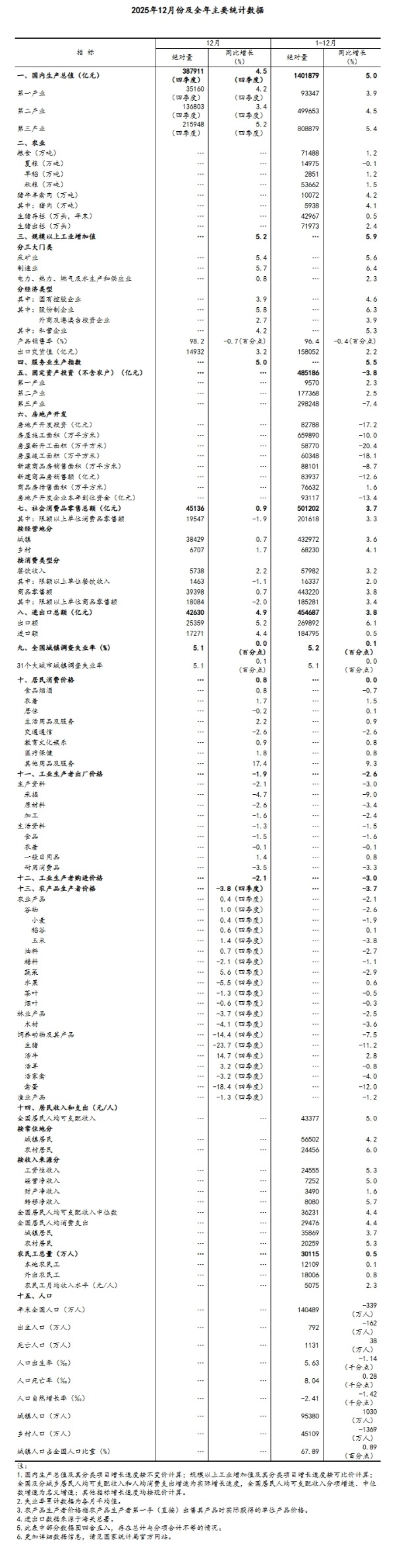 1月19日,国家统计局发布2025年中国经济年报。初步核算,全年国内生产总值1401879亿元,按不变价格计算,比上年增长5.0%。分季度看,一季度国内生产总值同比增长5.4%,二季度增长5.2%,三季度增长4.8%,四季度增长4.5%。从环比看,四季度国内生产总值增长1.2%。 统计局全文如下: 2025年经济发展向新向优 预期目标圆满实现 2025年,面对国内外经济环境的复杂变化,在以习近平同志为核心的党中央坚强领导下,各地区各部门深入贯彻落实党中央、国务院决策部署,坚定不移贯彻新发展理念、推动高质量发展,统筹国内国际两个大局,统筹发展和安全,实施更加积极有为的宏观政策,纵深推进全国统一大市场建设,国民经济运行顶压前行、向新向优,高质量发展取得新成效,经济社会发展主要目标任务圆满实现,“十四五”胜利收官。 初步核算,全年国内生产总值1401879亿元,按不变价格计算,比上年增长5.0%。分产业看,第一产业增加值93347亿元,比上年增长3.9%;第二产业增加值499653亿元,增长4.5%;第三产业增加值808879亿元,增长5.4%。分季度看,一季度国内生产总值同比增长5.4%,二季度增长5.2%,三季度增长4.8%,四季度增长4.5%。从环比看,四季度国内生产总值增长1.2%。 一、粮食增产丰收,畜牧业稳定增长 全年全国粮食总产量71488万吨,比上年增加838万吨,增长1.2%。其中,夏粮产量14975万吨,下降0.1%;早稻产量2851万吨,增长1.2%;秋粮产量53662万吨,增长1.5%。分品种看,小麦产量14007万吨,基本持平;玉米产量30124万吨,增长2.1%;稻谷产量20904万吨,增长0.7%;大豆产量2091万吨,增长1.3%。全年猪牛羊禽肉产量10072万吨,比上年增长4.2%,首次超过1亿吨。其中,猪肉产量5938万吨,增长4.1%;牛肉产量801万吨,增长2.8%;羊肉产量496万吨,下降4.2%;禽肉产量2837万吨,增长6.7%。牛奶产量4091万吨,增长0.3%;禽蛋产量3498万吨,下降2.5%。全年生猪出栏71973万头,增长2.4%;年末生猪存栏42967万头,增长0.5%。 二、工业生产较快增长,装备制造业和高技术制造业增势较好 全年全国规模以上工业增加值比上年增长5.9%。分三大门类看,采矿业增加值增长5.6%,制造业增长6.4%,电力、热力、燃气及水生产和供应业增长2.3%。装备制造业增加值增长9.2%,高技术制造业增加值增长9.4%,增速分别快于规模以上工业3.3、3.5个百分点。分经济类型看,国有控股企业增加值增长4.6%;股份制企业增长6.3%,外商及港澳台投资企业增长3.9%;私营企业增长5.3%。分产品看,3D打印设备、工业机器人、新能源汽车产品产量分别增长52.5%、28.0%、25.1%。12月份,规模以上工业增加值同比增长5.2%,环比增长0.49%。12月份,制造业采购经理指数为50.1%,比上月上升0.9个百分点;企业生产经营活动预期指数为55.5%,上升2.4个百分点。1—11月份,全国规模以上工业企业实现利润总额66269亿元,同比增长0.1%。 三、服务业平稳增长,现代服务业发展良好 全年服务业增加值比上年增长5.4%。其中,信息传输、软件和信息技术服务业,租赁和商务服务业,交通运输、仓储和邮政业,批发和零售业,住宿和餐饮业增加值分别增长11.1%、10.3%、5.2%、5.0%、4.9%。12月份,服务业生产指数同比增长5.0%。其中,信息传输、软件和信息技术服务业,租赁和商务服务业,金融业生产指数分别增长14.8%、11.3%、6.5%。1—11月份,规模以上服务业企业营业收入同比增长7.8%。12月份,服务业商务活动指数为49.7%,比上月上升0.2个百分点;服务业业务活动预期指数为56.4%,上升0.5个百分点。其中,电信广播电视及卫星传输服务、货币金融服务、资本市场服务等行业商务活动指数均位于60.0%以上高位景气区间。 四、市场销售规模扩大,服务零售较快增长 全年社会消费品零售总额501202亿元,比上年增长3.7%。按经营单位所在地分,城镇消费品零售额432972亿元,增长3.6%;乡村消费品零售额68230亿元,增长4.1%。按消费类型分,商品零售额443220亿元,增长3.8%;餐饮收入57982亿元,增长3.2%。基本生活类和部分升级类商品销售增势较好,全年限额以上单位通讯器材类、文化办公用品类、体育娱乐用品类、家用电器和音像器材类、粮油食品类商品零售额分别增长20.9%、17.3%、15.7%、11.0%、9.3%。全国网上零售额159722亿元,比上年增长8.6%。其中,实物商品网上零售额130923亿元,增长5.2%,占社会消费品零售总额的比重为26.1%。12月份,社会消费品零售总额同比增长0.9%,环比下降0.12%。全年服务零售额比上年增长5.5%。其中,文体休闲服务类、通讯信息服务类、旅游咨询租赁服务类、交通出行服务类零售额较快增长。 五、固定资产投资同比下降,制造业投资保持增长 全年全国固定资产投资(不含农户)485186亿元,比上年下降3.8%;扣除房地产开发投资,全国固定资产投资下降0.5%。分领域看,基础设施投资下降2.2%,制造业投资增长0.6%,房地产开发投资下降17.2%。全国新建商品房销售面积88101万平方米,下降8.7%;新建商品房销售额83937亿元,下降12.6%。分产业看,第一产业投资增长2.3%,第二产业投资增长2.5%,第三产业投资下降7.4%。民间投资下降6.4%;扣除房地产开发投资,民间投资下降1.9%。高技术产业中,信息服务业,航空、航天器及设备制造业投资分别增长28.4%、16.9%。12月份,固定资产投资(不含农户)环比下降1.13%。 六、货物进出口稳定增长,贸易结构持续优化 全年货物进出口总额454687亿元,比上年增长3.8%。其中,出口269892亿元,增长6.1%;进口184795亿元,增长0.5%。民营企业进出口增长7.1%,占进出口总额的比