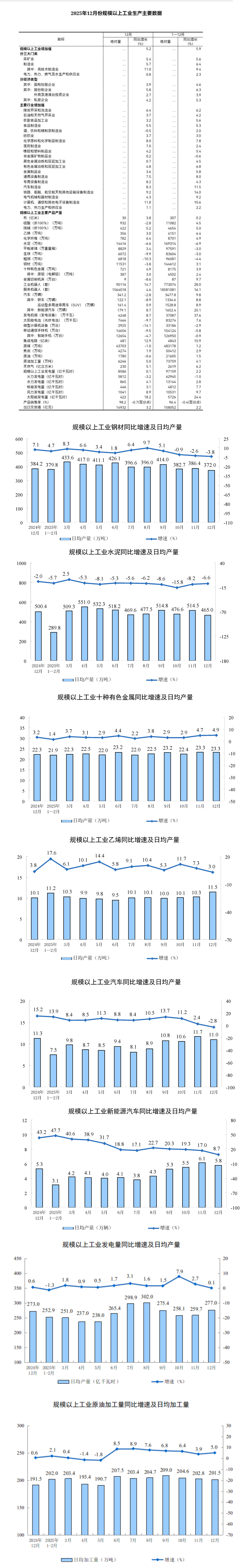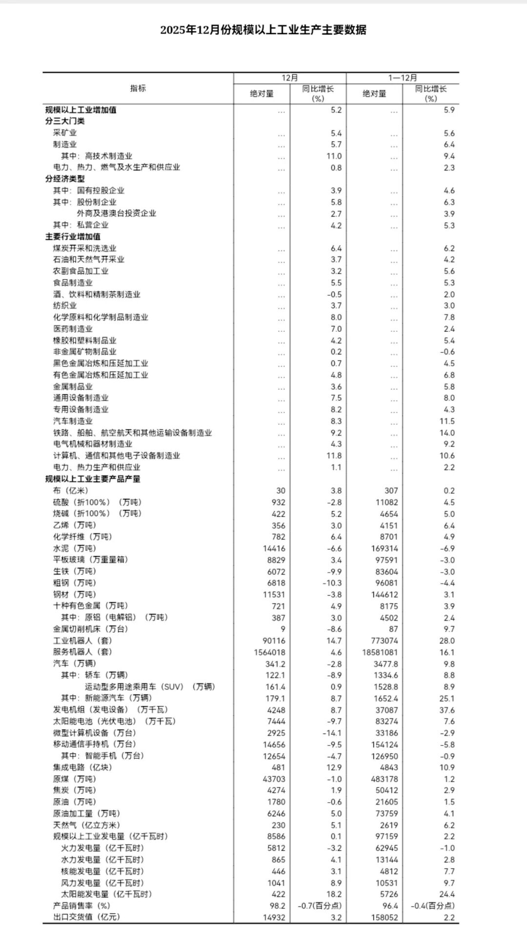 分三大门类看,12月份,采矿业增加值同比增长5.4%,制造业增长5.7%,电力、热力、燃气及水生产和供应业增长0.8%。 分经济类型看,12月份,国有控股企业增加值同比增长3.9%;股份制企业增长5.8%,外商及港澳台投资企业增长2.7%;私营企业增长4.2%。 分行业看,12月份,41个大类行业中有33个行业增加值保持同比增长。其中,煤炭开采和洗选业增长6.4%,石油和天然气开采业增长3.7%,农副食品加工业增长3.2%,酒、饮料和精制茶制造业下降0.5%,纺织业增长3.7%,化学原料和化学制品制造业增长8.0%,非金属矿物制品业增长0.2%,黑色金属冶炼和压延加工业增长0.7%,有色金属冶炼和压延加工业增长4.8%,通用设备制造业增长7.5%,专用设备制造业增长8.2%,汽车制造业增长8.3%,铁路、船舶、航空航天和其他运输设备制造业增长9.2%,电气机械和器材制造业增长4.3%,计算机、通信和其他电子设备制造业增长11.8%,电力、热力生产和供应业增长1.1%。 分产品看,12月份,规模以上工业623种产品中有325种产品产量同比增长。其中,钢材11531万吨,同比下降3.8%;水泥14416万吨,下降6.6%;十种有色金属721万吨,增长4.9%;乙烯356万吨,增长3.0%;汽车341.2万辆,下降2.8%,其中新能源汽车179.1万辆,增长8.7%;发电量8586亿千瓦时,增长0.1%;原油加工量6246万吨,增长5.0%。 12月份,规模以上工业企业产品销售率为98.2%,同比下降0.7个百分点;规模以上工业企业实现出口交货值14932亿元,同比名义增长3.2%。