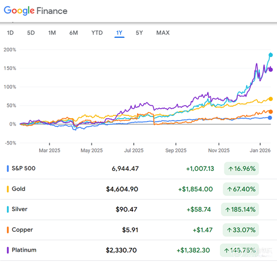 诚然,全球股市在特朗普回归后也创下新高。 铜亦不例外,因其与GDP增长高度关联。 但无论对特朗普持何种态度,过去12个月里,特朗普都在几乎所能想到的每个领域里颠覆了旧有规则。 这导致黄金与白银创下自1979年以来最强劲的年度涨幅,铂金亦创下现代史上最大涨幅并刷新历史高位。如今随着2026年开启,特朗普言行屡屡超出世人想象,贵金属价格再次直线飙升。 一位金融评论员针对特朗普在社交媒体上的言论及其对美联储的法律攻击指出:“价格管制、利率上限以及美联储独立性的削弱——有趣的是,这些如今突然成了’右派’的政策。” 另一位评论员则针对美国石油巨头在冒险投资委内瑞拉前要求特朗普提供担保的行为讽刺道:“资本主义留给你们,社会主义留给他们。” 还人针对美国绑架逮捕尼古拉斯·马杜罗评论道:“这是老牌殖民主义行径。比利时并未因利奥波德国王掠夺刚果而受益,美国人难道真会天真到相信这种鬼话?” 另一位评论者讽刺道:“与其向银行放贷美元,美联储不如把鲍威尔的脊梁骨借给共和党参议员用用……” 而随着特朗普政府启动对美联储及其主席的刑事调查,一些共和党议员似乎突然自己找回了“脊梁骨”。 至于移民官员击毙“疯癫左翼分子”或其他”无休止的媒体狂潮”,一位自称“自由意志主义者”的领结男士表示:“你可以赞同或反对政策,但对深层政府的核心挑战是不可否认的大主题……美国和整个西方的未来都取决于这场较量的结果。” 无论你对新白宫作何评价,贵金属确实“钟爱”特朗普(风险)。去年黄金与白银创下自1979年以来最快涨幅。更具参照意义的或许是1970年代初期,当“尼克松冲击”颠覆美元与黄金固定比价,国际秩序、信心与联盟体系随之崩塌的时候,黄金曾连续数年出现逾50%的年涨幅。 至于企图控制格陵兰岛?这可比尼克松的野心疯狂得多。 换言之,特朗普缔造的“新世界乱局”正青睐那些长期将黄金奉为独立与实力象征(及工具)的军事强国。随着各国央行纷纷寻求反美元乃至反西方的资产作为储备支撑,主权黄金需求持续为黄金的根本上行趋势构筑坚实基底,并由此延伸至高贝塔值的贵金属领域。 但2025年的市场表明,真正推动金价飙升的动力源自私人投资需求,其影响力远超消费端珠宝购买的萎缩。2026年初的市场态势再次印证了这一逻辑。因为无论更好或更坏,我们脚下的基石仍在持续颤动…… 而这些前现代货币已戏剧性回归,再次确证了它们作为21世纪迄今表现最佳资产的王者地位。 白银网 |
