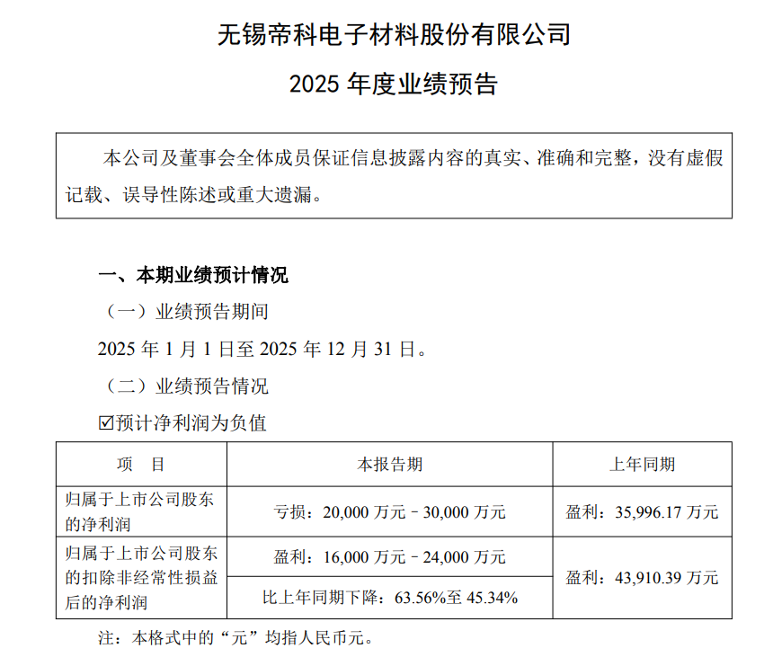 1月15日,帝科股份发布投资者活动记录表,在提及2025年业绩预告时,帝科股份表示,2025年归属于上市公司股东的净利润预计亏损2亿元至3亿元(上年同期盈利3.6亿元);扣除非经常性损益后的净利润预计盈利1.6亿元至2.4亿元(上年同期盈利4.39亿元),同比下降63.56%至45.34%。以上财务数据为初步测算结果,未经审计,与会计师事务所预沟通无重大分歧。
