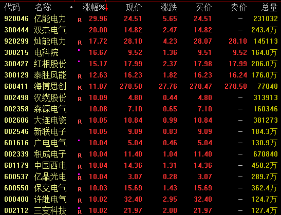 电气设备股爆发 电气设备板块盘中全线爆发,截至收盘,亿能电力尾盘30%涨停,双杰电气20%涨停,灿能电力涨近18%,汉缆股份、森源电气、积成电子等连续两日涨停,思源电气、特变电工尾盘均涨停,另还有十余股涨停。
