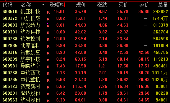 航空股拉升 军工板块发力走高,航空股表现亮眼。截至收盘,航亚科技涨超15%,中航机载、航发动力、航发科技、航发控制等均涨停。