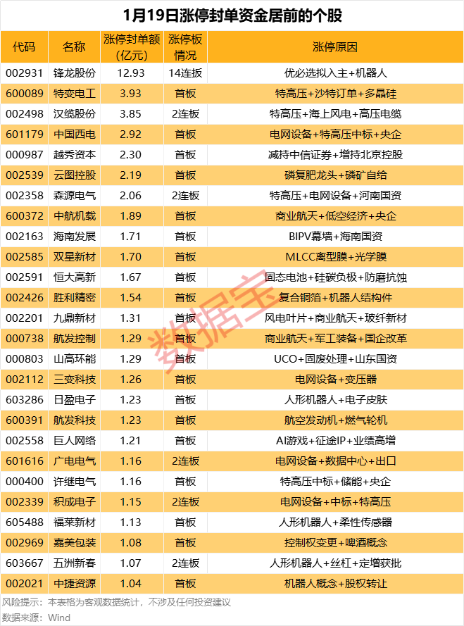 截至今日(1月19日)收盘,上证指数报收4114点,上涨0.29%;深证成指收于14294.05点,上涨0.09%;创业板指下跌0.70%,科创50指数下跌0.48%。 不含未开板新股,今日可交易A股中,上涨个股有3527只,占比超64%,下跌个股超1800只。其中,收盘封死涨停的有103只,跌停股有31只。另外,32股封板未遂,整体封板率为76.30%。 据证券时报·数据宝统计,在封死涨停的个股中,以所属行业来看,涨停个股居前的行业有电力设备、基础化工、机械设备,分别有24股、10股、7股。 在封死涨停的个股中,*ST生物、*ST荣控等15股为ST股。从连续涨停天数看,锋龙股份已连收14个涨停板,连续涨停板数量最多。 以封单金额计算,锋龙股份、特变电工、汉缆股份等涨停板封单资金居前,分别有12.93亿元、3.93亿元、3.85亿元。 从封单力度(封单量占流通A股比例)来看,恒大高新、锋龙股份、天地在线等力度较大,分别为9.66%、9.45%、4.08%。