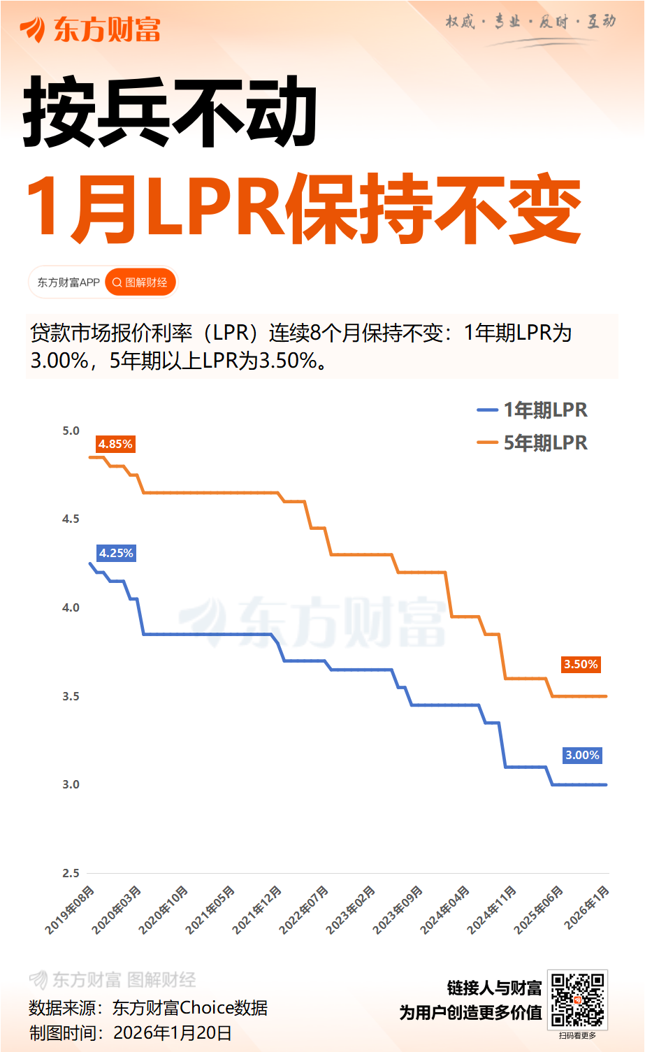 2026年首份贷款市场报价利率(LPR)报价出炉,LPR连续8个月保持不变。 中国人民银行授权全国银行间同业拆借中心公布,2026年1月20日,贷款市场报价利率(LPR)为:1年期LPR为3.00%,5年期以上LPR为3.50%,均较上月保持不变,以上LPR在下一次发布LPR之前有效。 作为主要政策利率的7天期逆回购利率自2025年5月下调后一直按兵不动,因此,LPR报价的定价基础本月未发生改变。LPR上一次调整是在2025年5月,1年期和5年期以上LPR均下调10个基点。 1月19日,今年首次结构性“降息”落地。为更好发挥结构性货币政策工具的激励作用,引导金融机构加大对重大战略、重点领域和薄弱环节的支持力度,中国人民银行决定自2026年1月19日起,下调再贷款、再贴现利率0.25个百分点。下调后,3个月、6个月和1年期支农支小再贷款利率分别为0.95%、1.15%和1.25%,再贴现利率为1.5%,抵押补充贷款利率为1.75%,专项结构性货币政策工具利率为1.25%。 谈及备受关注的降准降息,中国人民银行新闻发言人、副行长邹澜1月15日在国新办发布会上表示“今年还有一定的空间”。他表示,从政策利率来看,外部约束方面,目前人民币汇率比较稳定,美元处于降息通道,总体来看汇率不构成很强的约束;内部约束方面,2025年以来银行净息差已经出现企稳的迹象,连续两个季度保持在1.42%,2026年还有规模较大的三年期及五年期等长期存款到期重定价,人民银行也下调了各项再贷款利率,这些都有助于降低银行付息成本、稳定净息差,为降息创造一定空间。