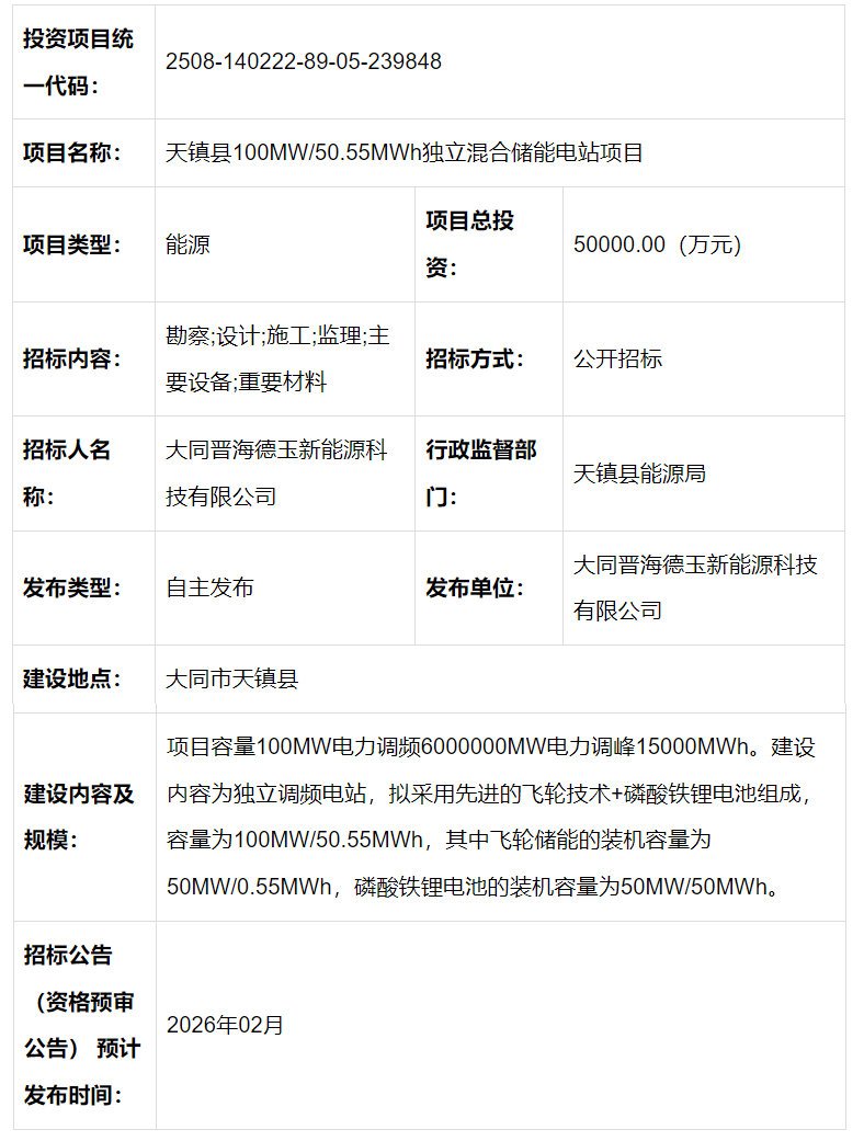 2026年1月19日,大同晋海德玉新能源科技有限公司自主发布天镇县100MW/50.55MWh独立混合储能电站项目相关信息,总投资达5亿元。 该项目属于能源类项目,建设地点位于山西大同天镇县,建设内容为独立调频电站,核心规模涵盖100MW储能容量、6000000MW电力调频及15000MWh电力调峰,技术上拟采用先进的飞轮技术与磷酸铁锂电池混合储能方案,其中飞轮储能装机容量为50MW/0.55MWh,磷酸铁锂电池装机容量为50MW/50MWh。 项目招标内容包括勘察、设计、施工、监理、主要设备及重要材料采购,招标方式为公开招标,该项目的招标公告预计将于2026年2月正式发布。 天镇县100MW/50.55MWh独立混合储能电站项目