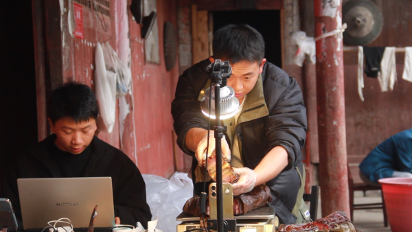 在另一边的农家小院内,主播面对镜头向直播间观众热情推介安化纸包腊肉,肥瘦相间、油润透红的腊肉在阳光下显得格外诱人。直播开启仅2小时,销售额就已突破2万元。