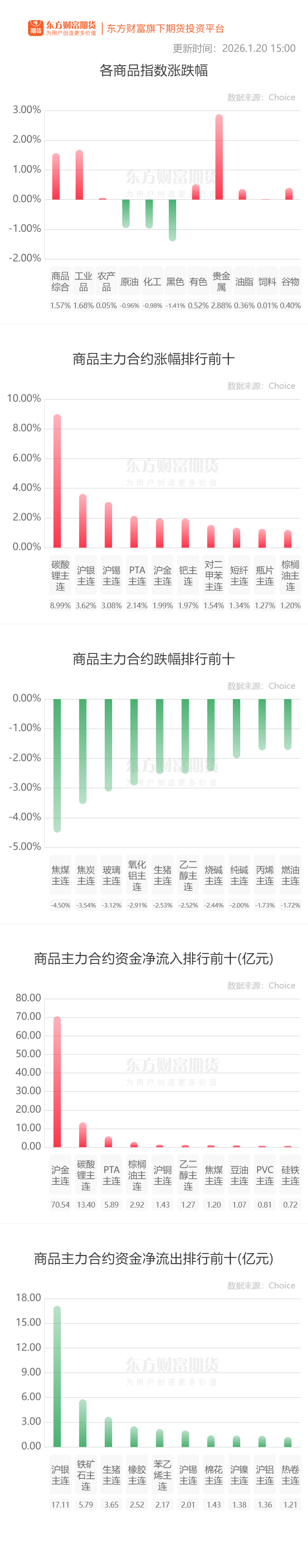 行情纵览![]() 宏观产经人民财讯:1月20日,国新办举行新闻发布会,介绍落实中央经济工作会议精神,推动“十五五”实现良好开局有关情况。国家发展改革委副主任王昌林表示,当前我国经济运行存在供强需弱的问题,接下来要坚持把宏观政策的发力点放在做强国内大循环上,全方位扩大国内需求,重点是要适应我们国家需求结构升级趋势。结合我们新一轮科技革命和产业变革的需要,今年,发改委将研究制定出台2026年—2030年扩大内需战略实施方案,以新供给创造新需求,提供强有力的创新举措和要素保障。 CCTV国际时讯:当地时间今天(1月20日)凌晨,美国总统特朗普搭乘专机从佛罗里达州返回华盛顿途中,在其社交平台“真实社交”上发图,暗示吞并丹麦自治领地格陵兰岛。 品种资讯黑色系期货 铁矿石:卫星数据显示,2026年1月12日-1月18日期间,澳大利亚、巴西七个主要港口铁矿石库存总量1173.6万吨,环比下降81.6万吨,小幅回落。目前库存量略低于第四季度的平均水平。(我的钢铁网) 钢材:截至2026年1月20日,11家钢厂发布2026年冬储政策,其中东北4家,华北3家,西北2家,西南2家,今日新增1家钢厂,2026年1月20日起开始收款,账面余额+上款金额次日起按日计息,月息7厘;可锁价可保价,到款客户优先享有锁价权和保值权,对应金额停止计息;此冬储政策收款截止日期2026年2月10日;提货截止日期2026年5月15日,到期后保值部分未提完款项转为现货款,执行当期销售政策。(我的钢铁网) 农产品期货 生猪:据农业农村部监测,截至1月20日14:00时,全国农产品批发市场猪肉平均价格为18.47元/公斤,较前一日上升0.1%;鸡蛋平均价格为8.13元/公斤,较前一日持平。(新华财经) 棕榈油:AMSPEC数据显示,马来西亚1月1-20日棕榈油出口环比增长8.64%。(财联社) 棉花:据张家港保税区纺织原料市场公布,截至2026年1月19日,张家港保税区棉花总库存3.57万吨,同比减少0.33%。其中保税棉3.28万吨,同比减少0.36%;非保税棉0.30万吨,同比增加0.37%。(新华财经) 有色/贵金属期货 沪金:受格陵兰岛紧张局势影响,现货黄金突破4700美元/盎司大关,再创历史新高。(财联社) 沪铜:深圳水贝有商家试探性推出了投资铜条,纯度为999.9,规格有500克和1000克,不过以1000克居多,一根1000克的投资铜条的报价从180元至280元。除了实体商场之外,淘宝等网站上也可以搜到类似产品。(21世纪经济报道) 碳酸锂:据海关总署数据,2025年12月中国锂辉石进口数量为78.85万吨,环比增加8.1%,环比主要增量为南非进口10.9万实物吨原矿。其中从澳大利亚进口31.0万吨,环比减少27.2%,同比增加1.9%;自津巴布韦进口13.2万吨,环比增加19.8%;自尼日利亚进口8.0万吨,环比减少13.1%;自马里进口7.7万吨,环比增加5.2%;新增自蒙古进口2.3万吨。(海关总署) 1月20日锂辉石远期现货价格上涨,澳大利亚CIF6中国锂辉石精矿报2030-2110美元/吨;津巴布韦CIF6中国锂辉石精矿报2010-2090美元/吨;巴西CIF6中国锂辉石精矿报2010-2070美元/吨;马里CIF6中国锂辉石精矿报1960-2040美元/吨;南非CIF中国锂辉石原矿报260-320美元/吨。(我的钢铁网) 能化期货 尿素:山东地区尿素行情偏弱僵持,小颗粒主流出厂成交1700-1760元/吨,大颗粒出厂参考1880-1900元/吨。临沂市场一手贸易商出货参考价格1750-1760元/吨附近,菏泽市场参考价格1730-1740元/吨附近。省内企业生产基本正常。短时部分企业价格小幅松动,但基于情绪的偏弱震荡,厂家新单成交尚未见好转。不过今日周边河南区域企业新单成交好转,参照其价格水平,山东价格稳定或者小幅松动后,也大概率会有适量新单,行情因此僵持波动运行。(隆众资讯) 橡胶:海关统计数据在线查询平台公布的数据显示,中国2025年12月天然及合成橡胶(包括胶乳)进口量为953,230.94吨,环比上升20.62%,同比增长18.45%。泰国是第一大进口来源地。(新华财经) 晚间关注无 (文章来源:东方财富研究中心) |