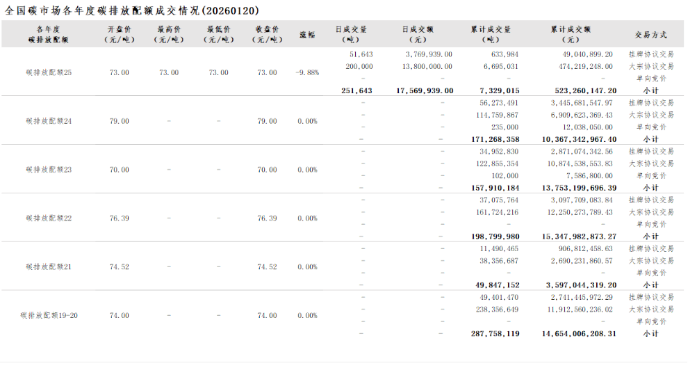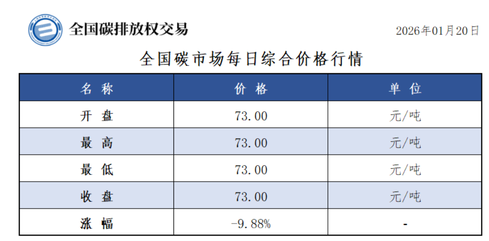1月20日讯: 今日全国碳市场综合价格行情为: 开盘价73.00元/吨,最高价73.00元/吨,最低价73.00元/吨,收盘价73.00元/吨,收盘价较前一日下跌9.88%。 今日挂牌协议交易成交量51,643吨,成交额3,769,939.00元;大宗协议交易成交量200,000吨,成交额13,800,000.00元;今日无单向竞价。 今日全国碳排放配额总成交量251,643吨,总成交额17,569,939.00元。 2026年1月1日至1月20日,全国碳市场碳排放配额成交量8,046,288吨,成交额580,217,980.20元。 截至2026年1月20日,全国碳市场碳排放配额累计成交量872,912,808吨,累计成交额58,242,836,211.77元。
