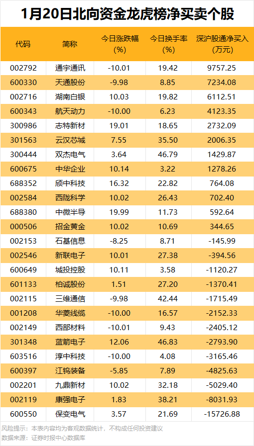 今日龙虎榜现身个股中,12股获北向资金净买入。净买入居首的是通宇通讯,金额为9757.25万元;天通股份、湖南白银紧随其后,净买入金额均超6000万元。 北向资金净卖出13股,保变电气净卖出金额居首,为1.57亿元。