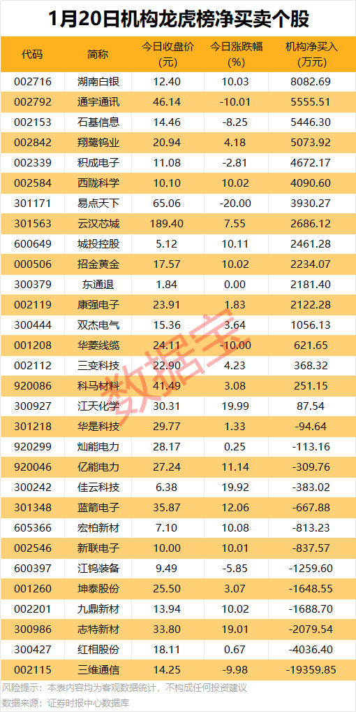 龙虎榜揭秘: 13股净买入金额均超千万元 今日龙虎榜中,净买入个股有17只,净卖出的个股为13只。13股净买入金额均超千万元,湖南白银获机构净买入8082.69万元,居首;其次是通宇通讯,机构净买入金额为5555.51万元。 机构净卖出个股中,三维通信遭机构净卖出1.94亿元,居首;紧随其后的是红相股份、志特新材,净卖出金额均超2000万元。