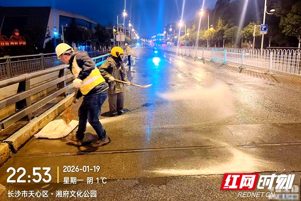 市政、园林等部门第一时间调配机械设备和人员 ,开展除冰行动。 多方联动,保障城市运行 区城管局作为铲雪除冰主力,提前备足铁铲、手套、雨衣、防滑鞋等工具,以及融雪剂、麻袋和各类机械化除冰设备。目前,该局已准备麻袋20000个、编织袋6000个、铲子2000把、雨衣雨鞋手套套装6000套、融雪剂800吨,并调配撒布机、吊车、登高车、除雪车、货车等各类机械车辆50余台,确保关键时刻拉得出、用得上。 针对桥梁、陡坡、主干道等易结冰区域,区市政中心将湘府路大桥列为核心防护区,安排14名应急作业人员和专用设备随时待命。一旦出现雨雪结冰迹象,立即启动“机械撒布+人工细化”协同作业,按照“雪落即清、冰结即除”标准,全力保障桥面畅通。 “雨雪天气路面湿滑、视线不清,追尾、剐蹭和车辆侧滑等事故容易多发。”长沙公安交管支队天心大队黑石铺中队民警缪涛提示,这类事故多因车速过快、跟车太近或操作不当引起。交警部门已在重点路段加强执勤,并配备拖车绳、防滑链等救援工具,随时为受困群众提供帮助。