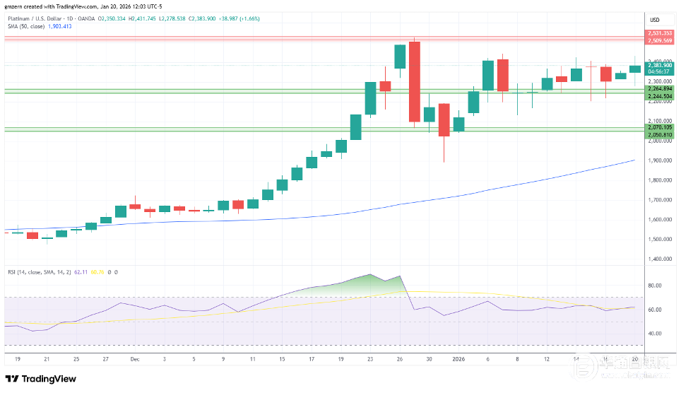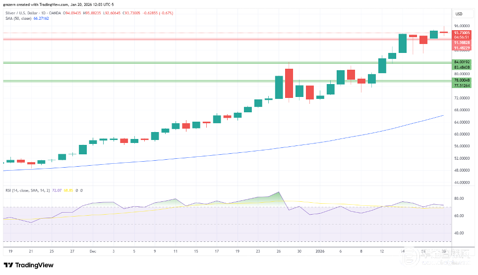 在格陵兰岛危机影响下,交易员仍保持看涨态度,黄金创下新高。丹麦养老基金抛售美国国债的决定为黄金市场提供了额外的支撑。 相对强弱指标(RSI)已处于超买区域,但短期内仍有很大的上涨空间。 白银
