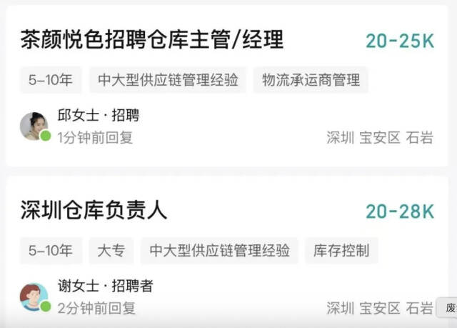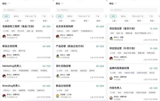 北上深岗位各有侧重 招聘平台BOSS直聘显示,茶颜悦色正在北京、深圳和上海放出多个岗位,每个区域的侧重也有所不同。 上海开放的岗位偏向品牌、内容与市场,如以4-4.5万元月薪招聘内容负责人,以4-6万元月薪招聘品牌负责人,以4.5-7.5万元月薪招聘市场负责人,5-6万元月薪招聘会员体系架构师等。 北京的岗位则偏向技术类,以1.5-6万元不等的月薪招聘数据产品经理,分别有备货计划方向、数据指标方向、供应链智能补货方向等。