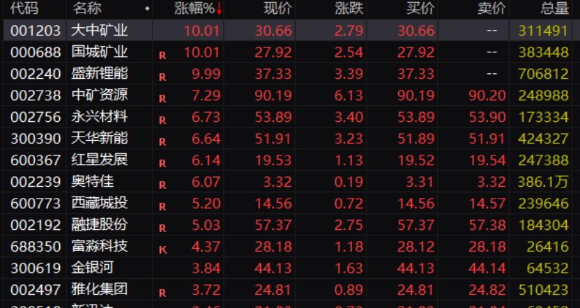 其他行业板块方面,有色金属、通信、计算机板块涨幅居前;煤炭、食品饮料等板块盘中跌幅居前。 概念板块方面,锂矿概念板块大涨,板块盘中涨幅超过2%,大中矿业、围城矿业、盛新锂能等股票盘中涨停。消息面上,今天上午国内碳酸锂期货大涨,主力合约盘中涨幅超过6%。