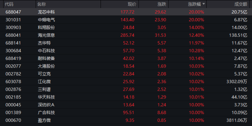 从行业板块和赛道来看,若按照申万一级行业划分,电子板块领涨,板块盘中涨幅超过2.8%,板块内个股掀起涨停潮。龙芯中科、中熔电气“20cm”涨停,科翔股份、杰华特等多股涨幅超过10%,大港股份、江化微等10多只股票涨停。
