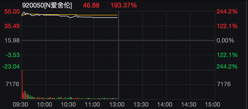 新股爱舍伦盘中涨幅超过200% A股市场今天有一只新股上市,为爱舍伦,该股盘中涨幅超过200%。