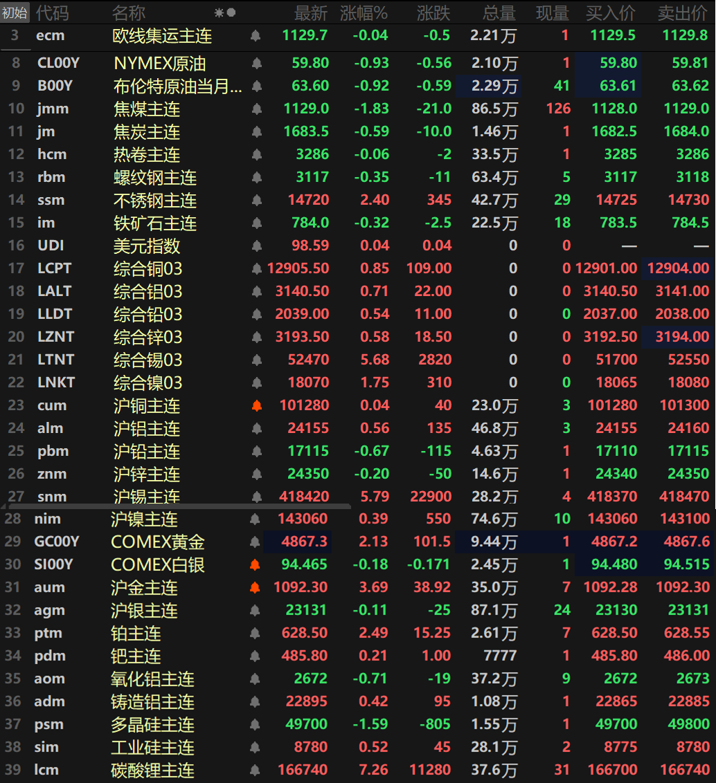 SMM 1月21日讯: 金属市场: 截至日间收盘,内盘基本金属普涨,仅沪铅和沪锌一同下跌,沪铅跌0.67%,沪锌跌0.2%。沪锡以高达5.79%的涨幅领涨,其余金属涨幅均在1%以内。氧化铝主连跌0.71%,铸造铝主连涨0.42%。 此外,碳酸锂主连今日继续大涨,以7.26%的涨幅收于166740元/吨;工业硅主连涨0.52%,多晶硅主连跌1.59%。欧线集运主连跌0.04%报1129.7。 外盘方面,截至15:03分,外盘基本金属集体飘红,伦锡以5.68%的涨幅领涨,伦镍涨1.75%,其余金属涨幅均在1%以内。 贵金属方面,截至15:03分,COMEX黄金涨2.13%,盘中最高冲至4891.1美元/盎司,逼近4900美元/盎司的整数关口,继续刷新其历史新高;COMEX白银跌0.18%;国内方面,沪金涨3.69%,盘中最高冲至1101.92元/克,续刷历史新高,沪银跌0.11%。 此外,铂主连涨2.49%,钯主连涨0.21%。 截至今日15:03分行情